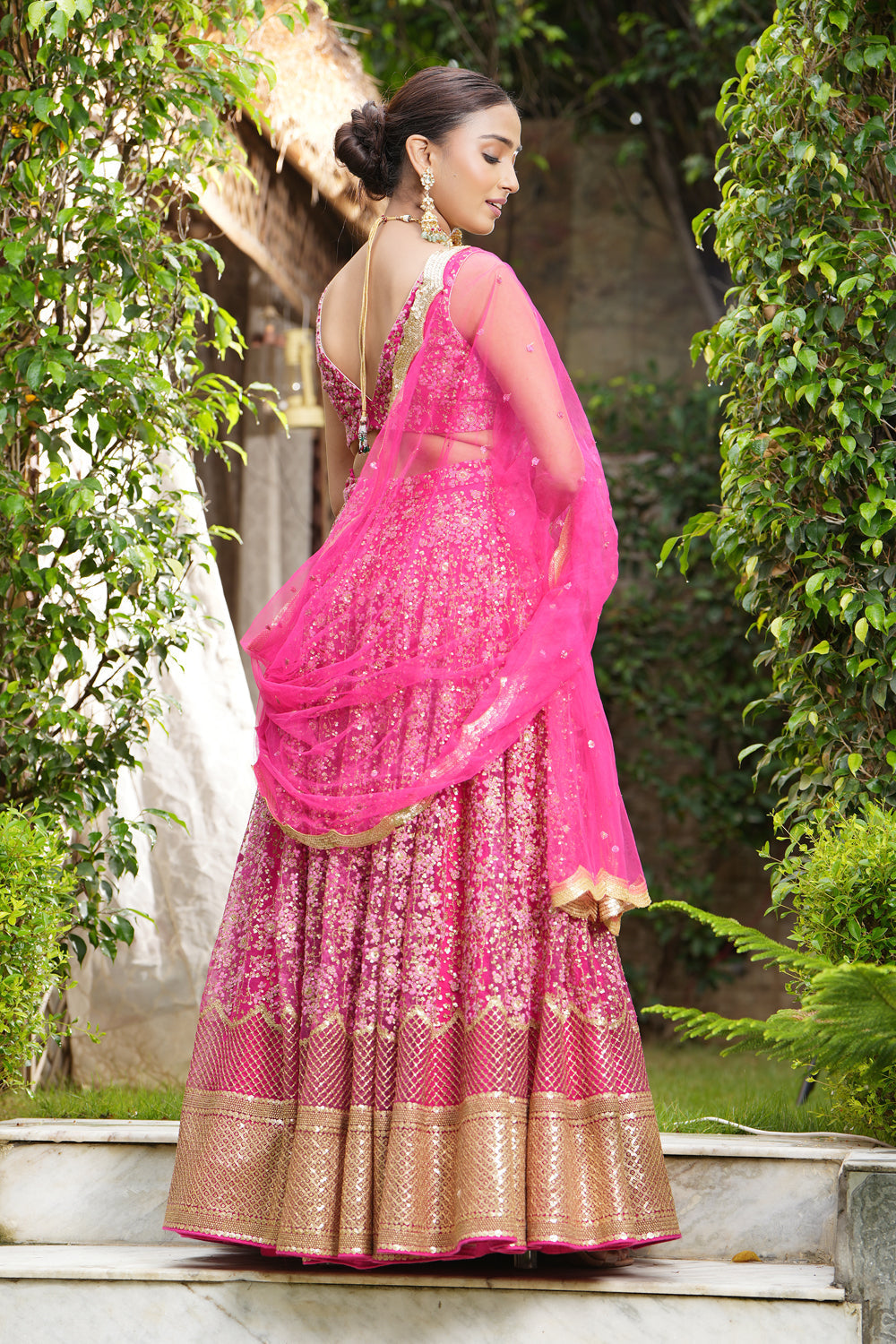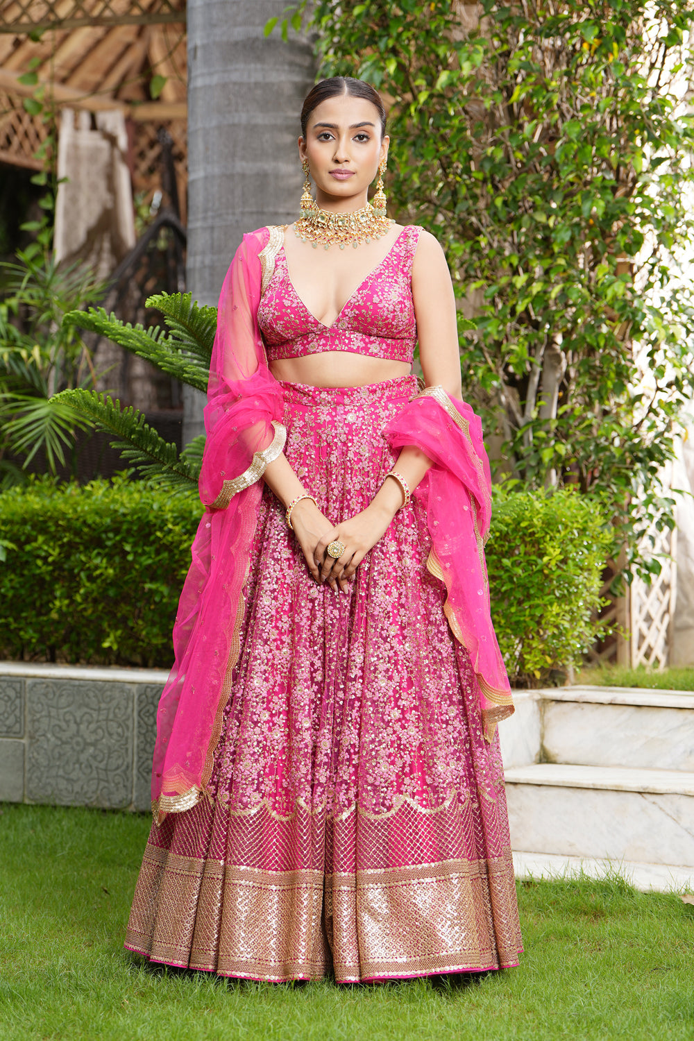 Deep pink gold lehenga, intricate embroidery on net, paired with wide v neckline blouse & net embellished dupatta.