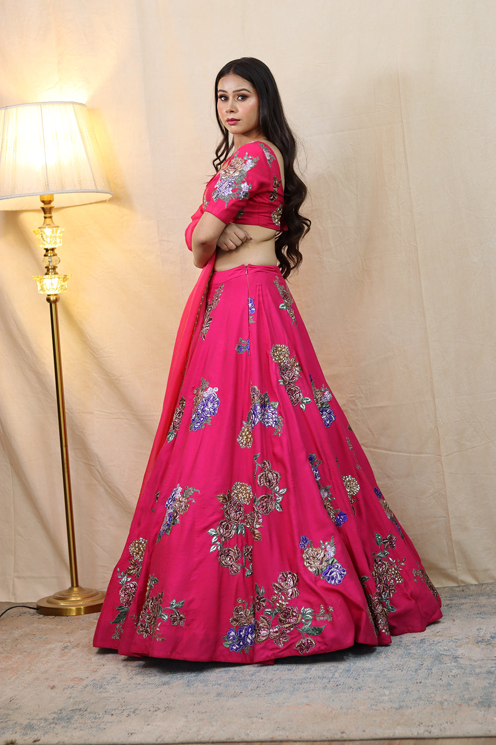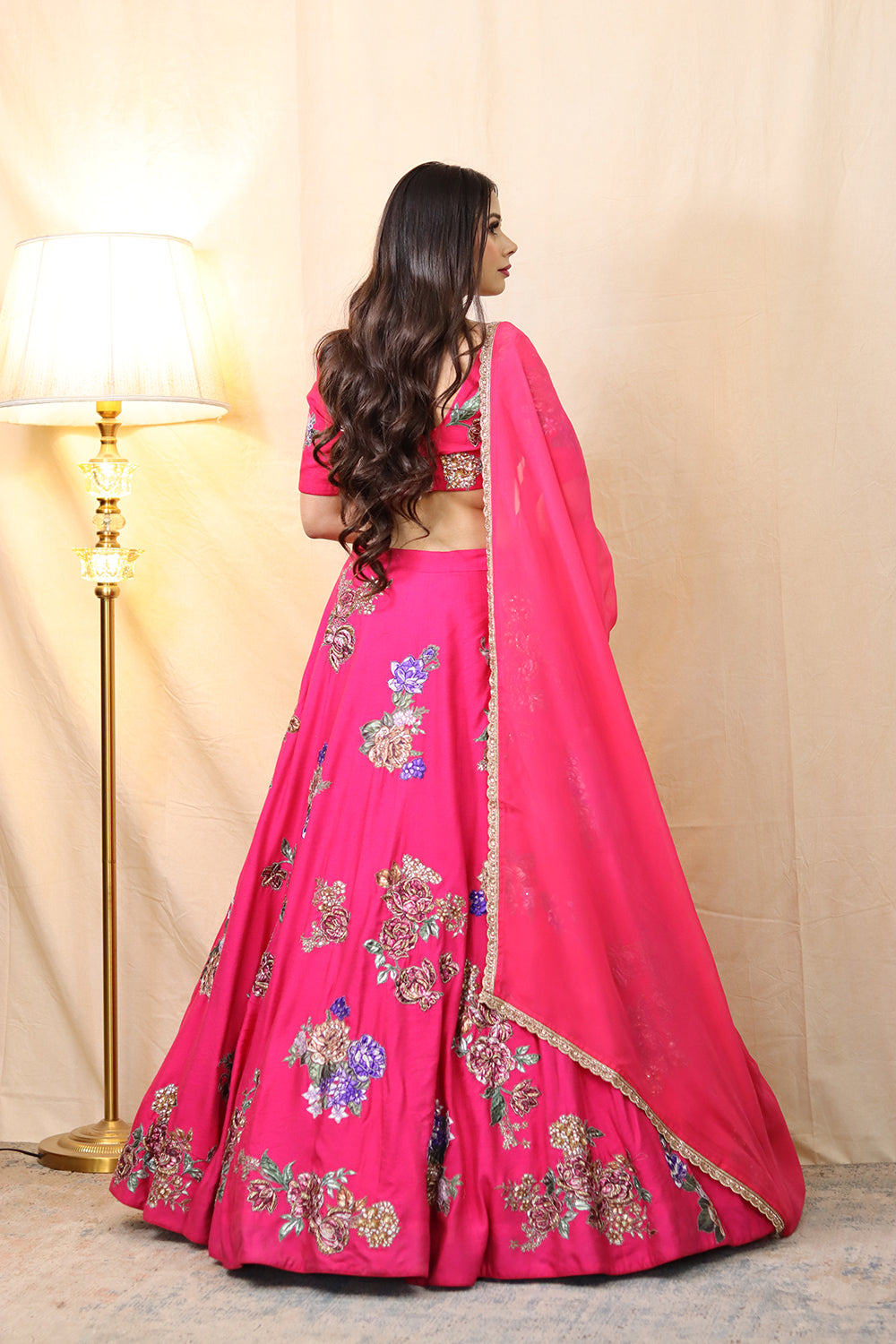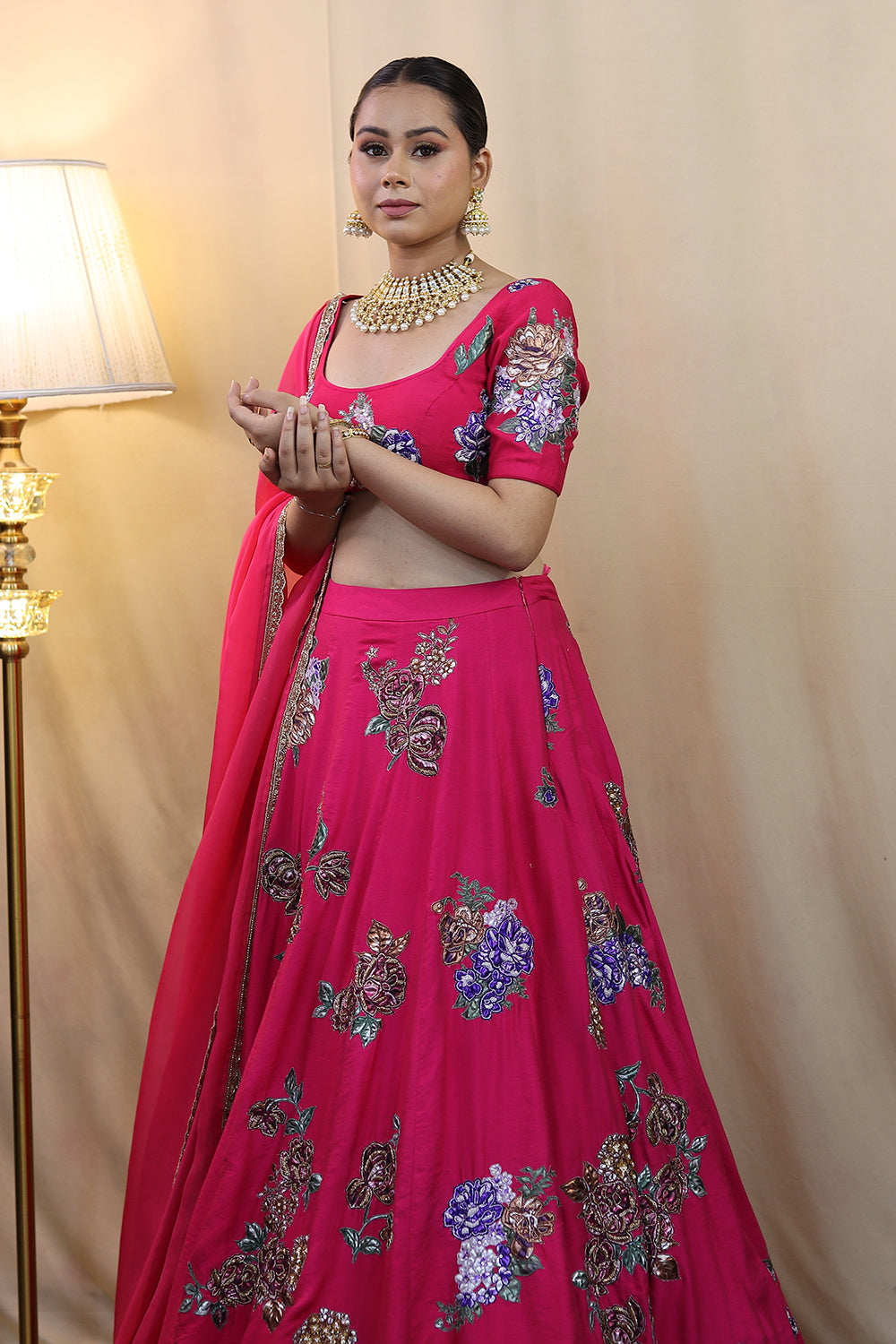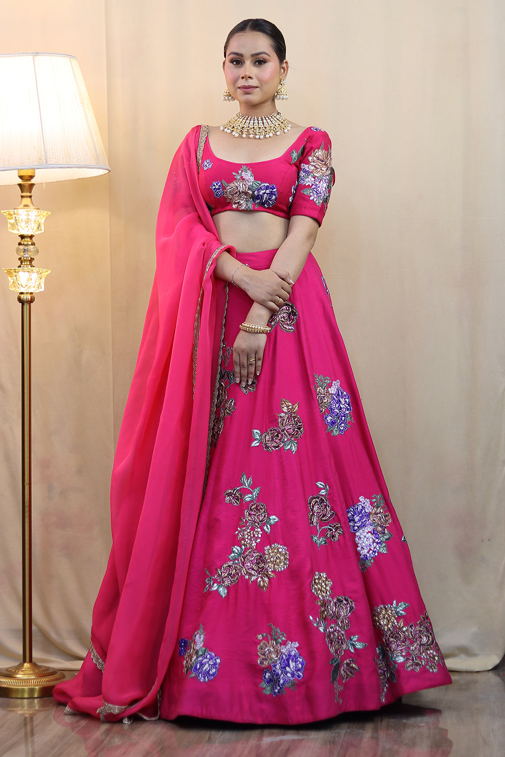 Delicate floral applique lehenga set with sequins highlights. teamed with deep u neckline blouse and organza dupatta.