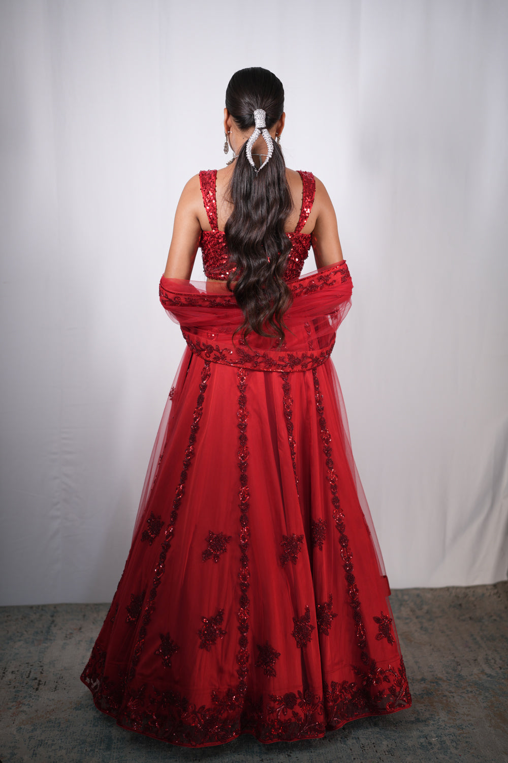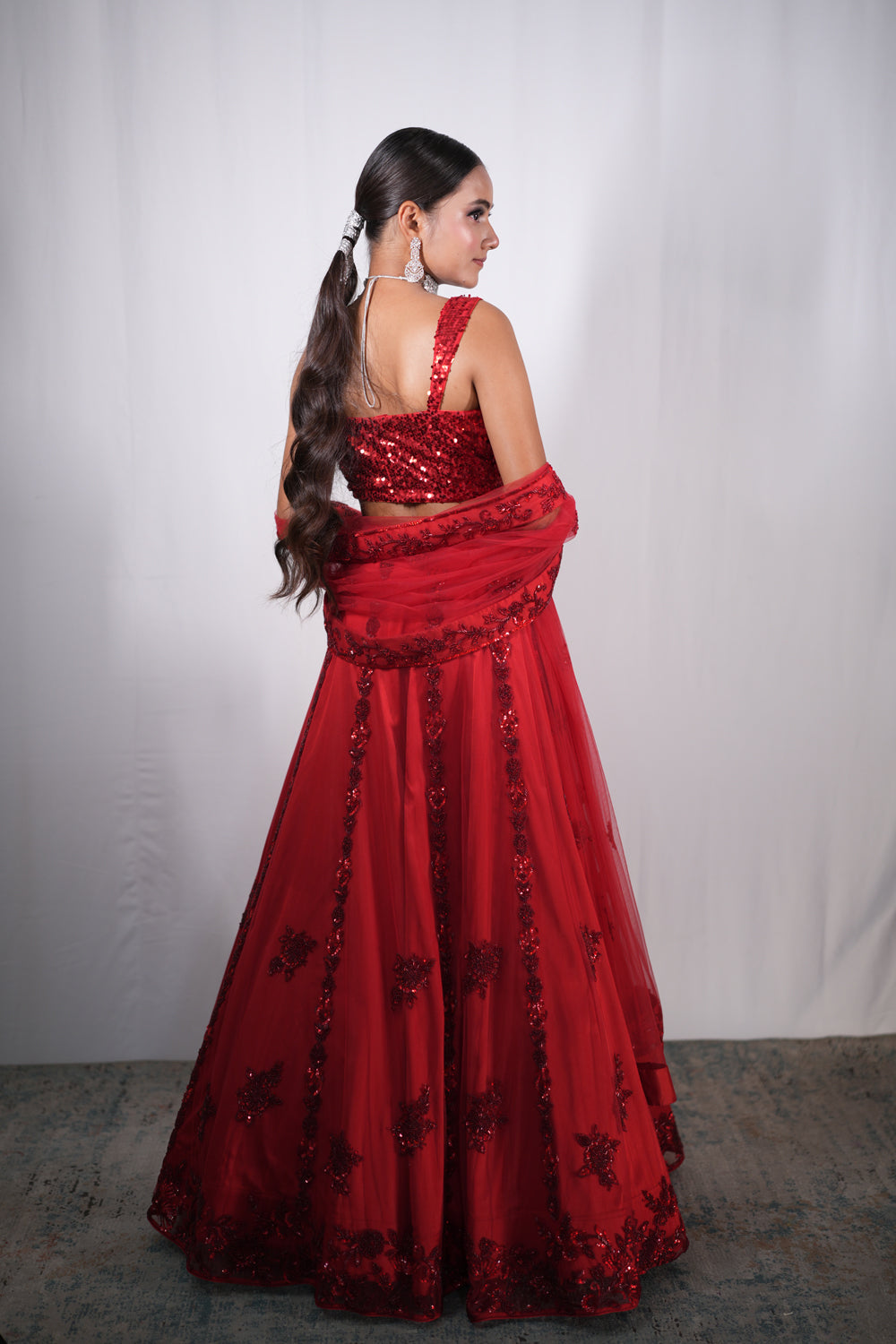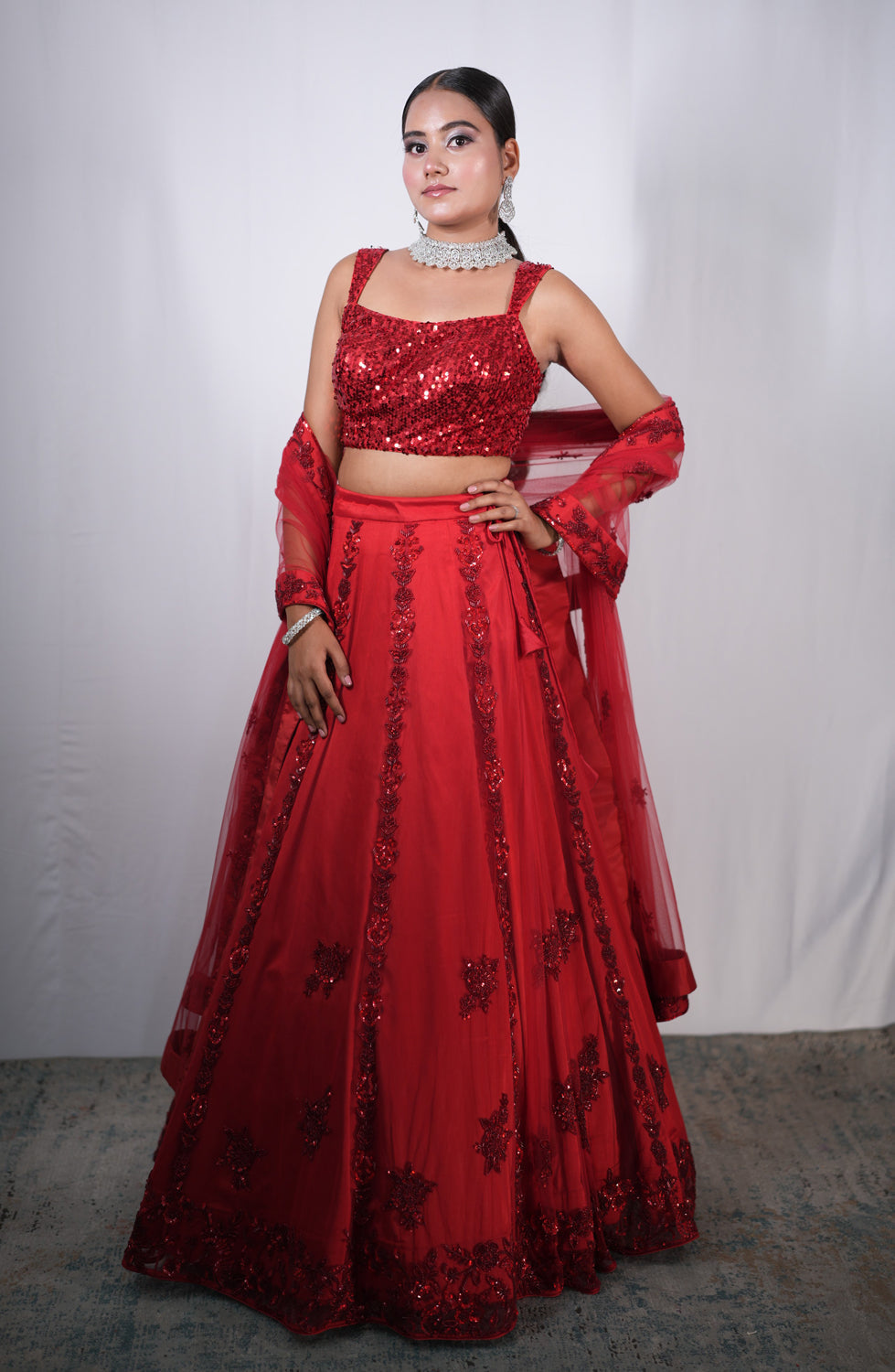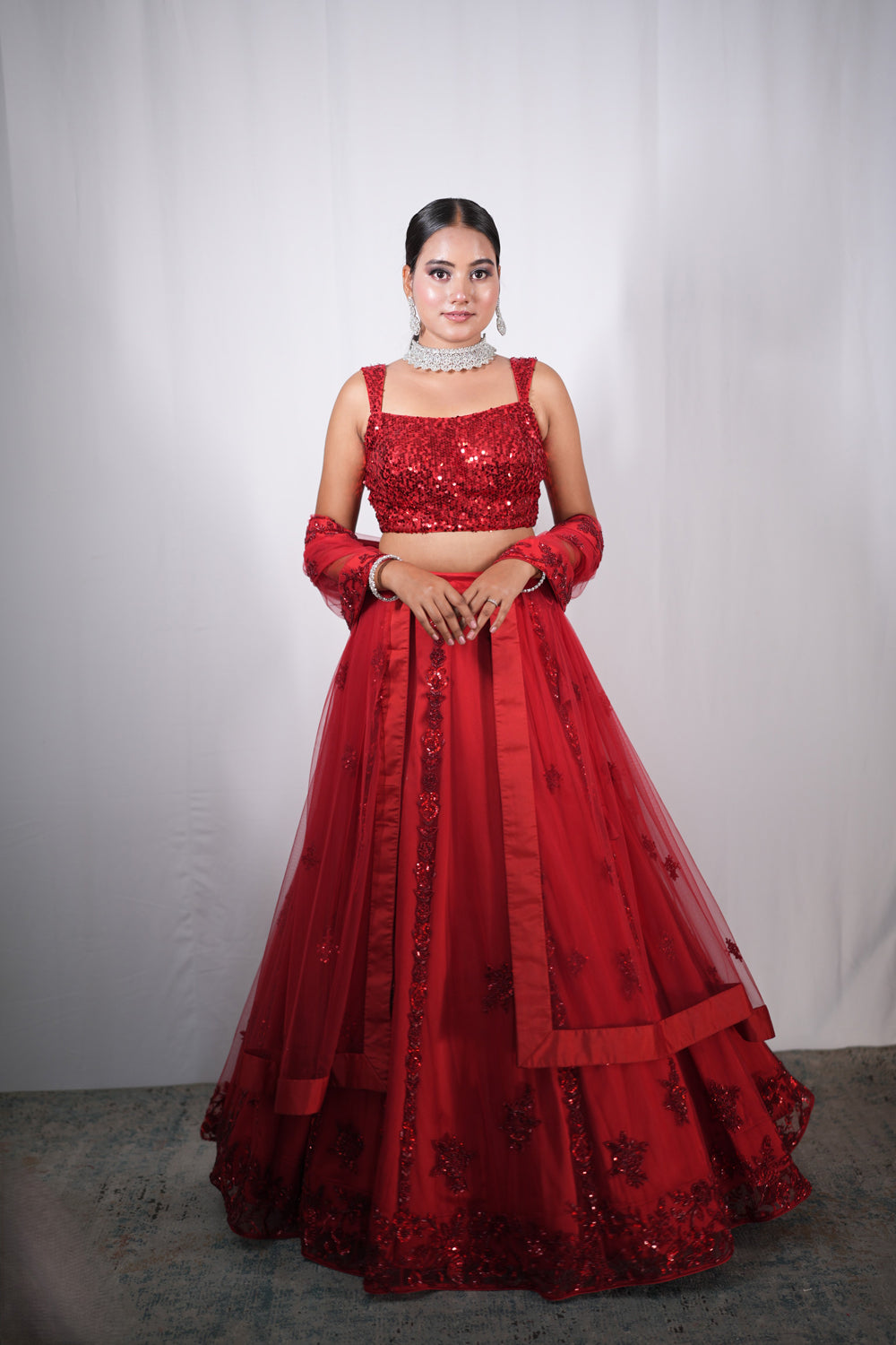 Red lehenga, intricate embroidery on net , paired with wide square neckline blouse & net embellished dupatta.