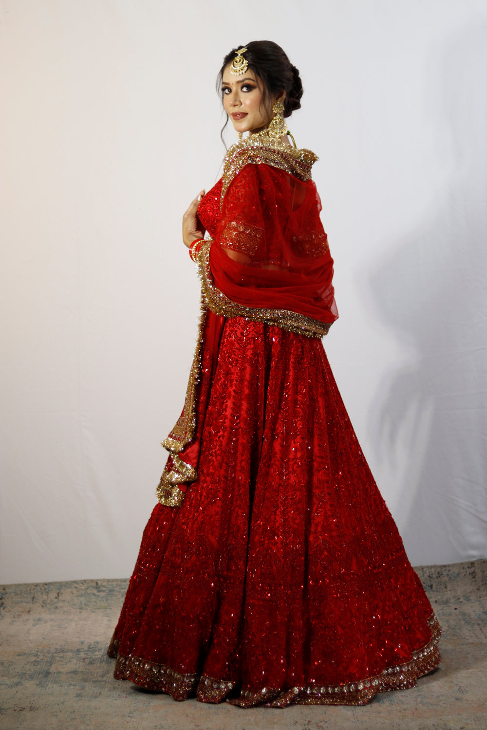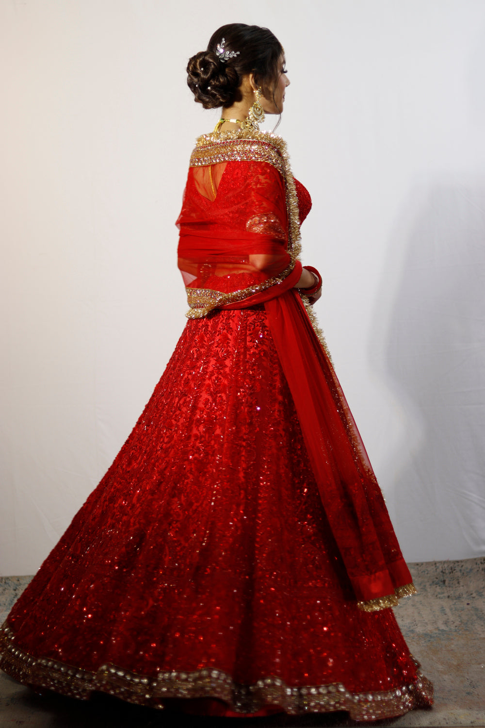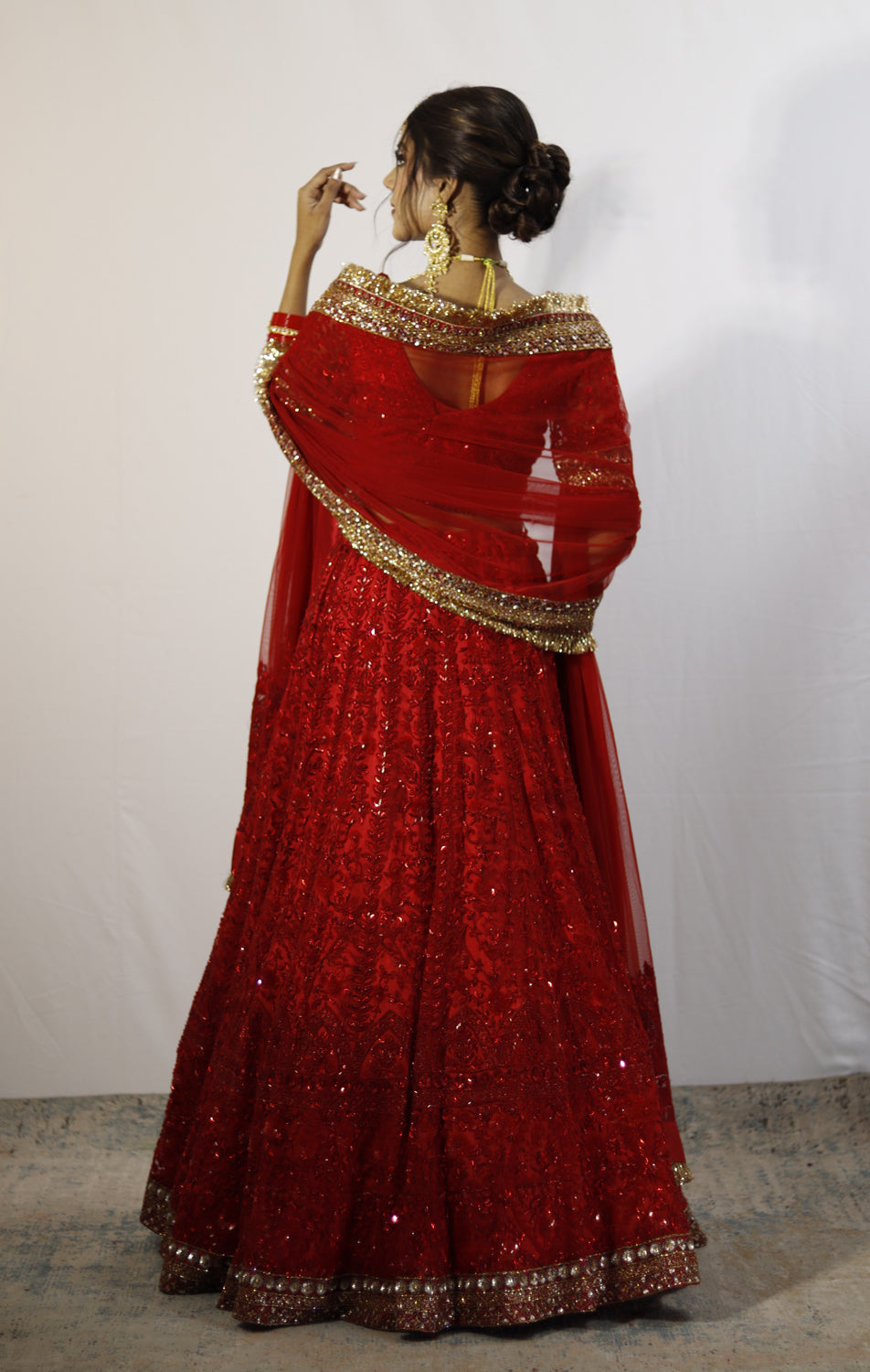 Red lehenga, intricate embroidery on net , paired with wide round neckline blouse & net embellished dupatta.