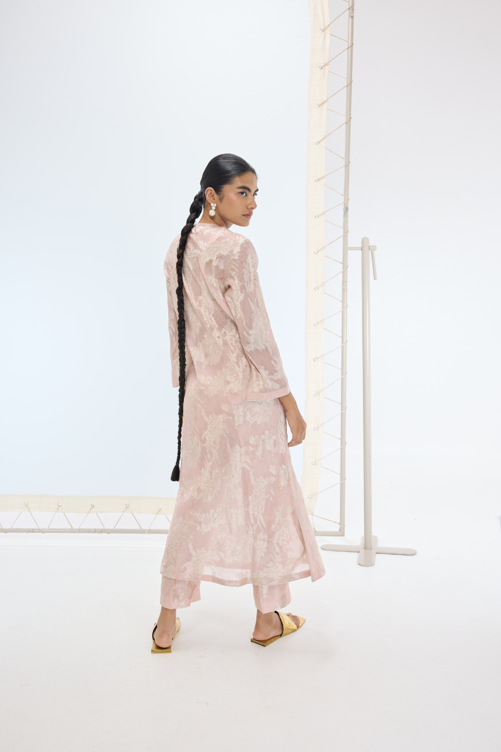Introducing Ekaya Pastels, a collection that reimagines the beauty of craft through a creative interplay between delicate French lace and our signature Banarasi textile. The Diana Kurta Set in a refreshingly peachy shade is handwoven in pure organza silk using the silver floral jaal technique. Lightweight and fluid, this can be easily styled from a day to night look in warm summer days.