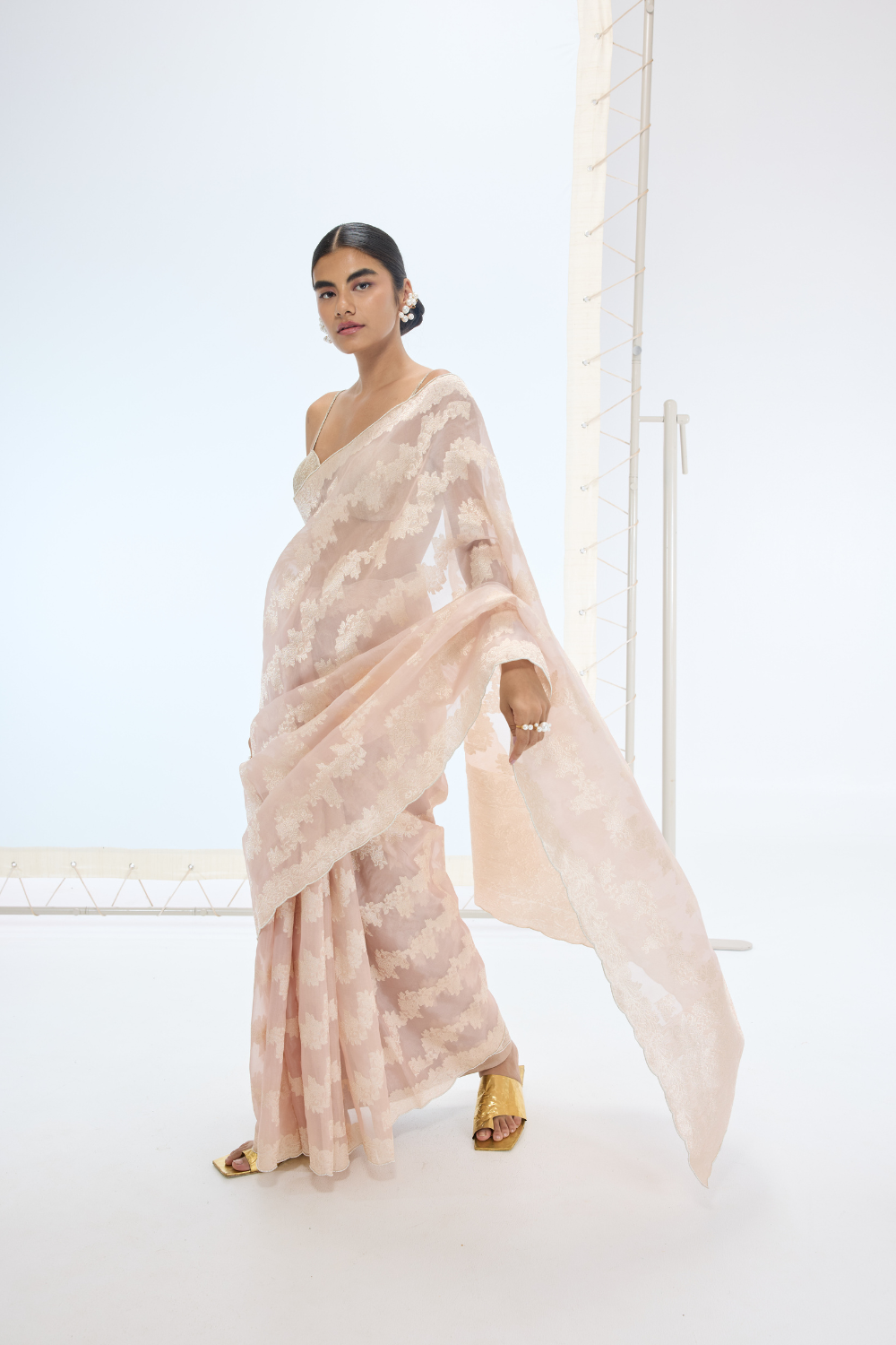 Introducing Ekaya Pastels—where the timeless artistry of Banarasi weaves meets the delicate elegance of French-inspired design. The Velma Saree in a refreshing peach hue is handwoven in pure organza using the intricate kadwa weaving technique, a testament to fine craftsmanship. Finished with delicate beaded edges, this saree is lightweight, fluid, and designed to drape effortlessly—offering graceful movement and a soft, luxurious feel against the skin. For a polished touch, style it with the Ekaya x Anaash Pallu Holder—securing your drape with subtle sophistication. The beauty of reinvention lies in its subtlety. Discover timeless sarees reinterpreted for today’s world—modern, wearable, and steeped in legacy.