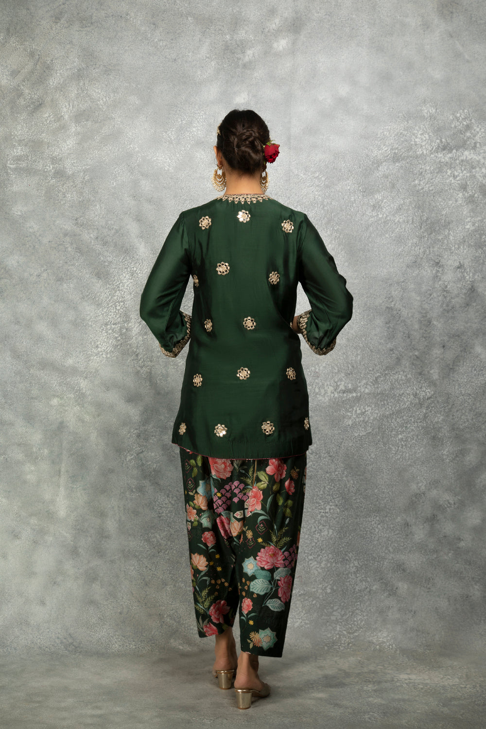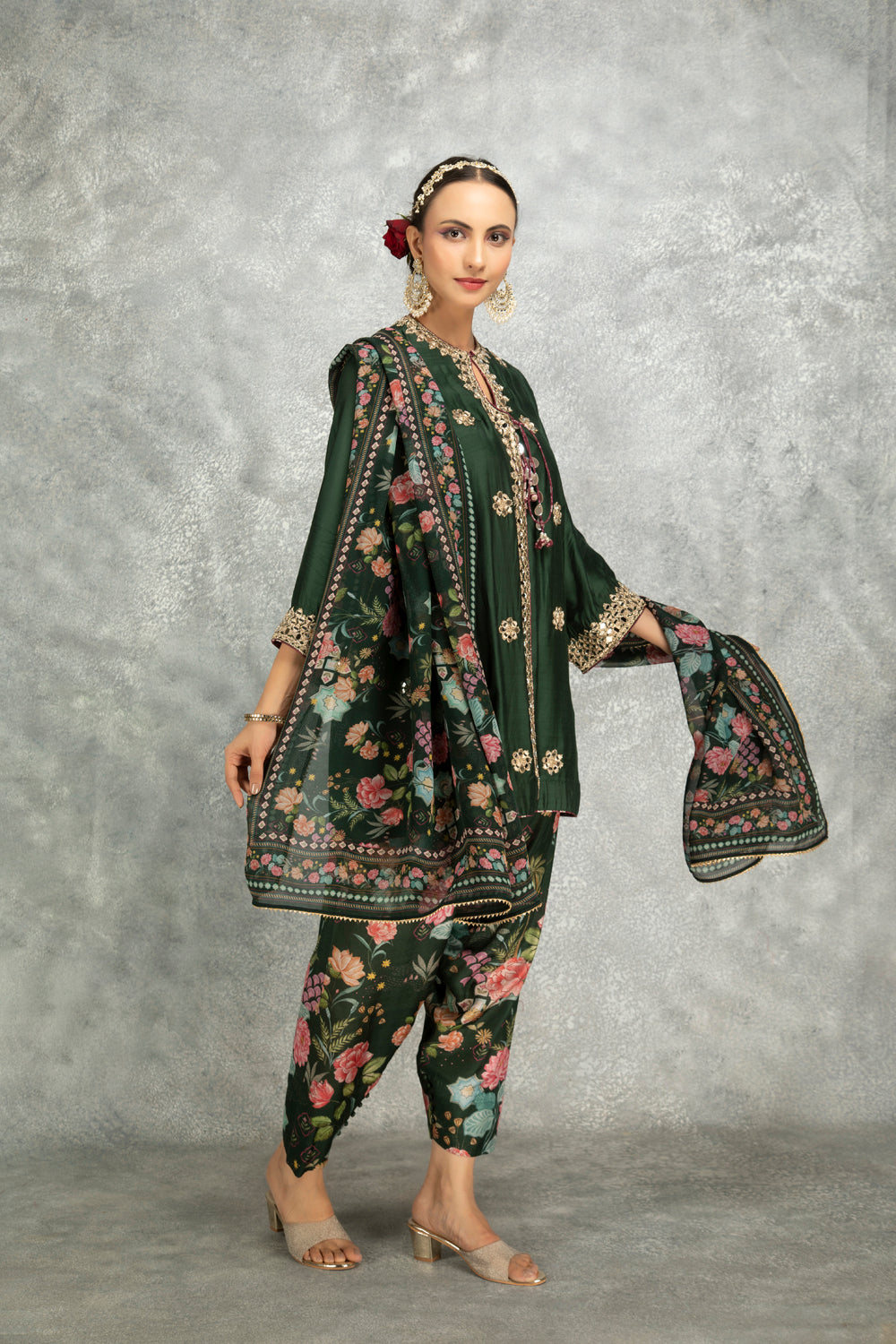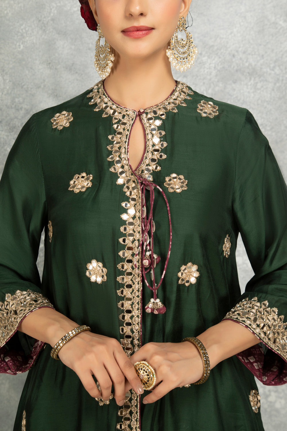 Green Mirror Embroidered Angrakha With Printed Pants & Dupatta Set Of 3
