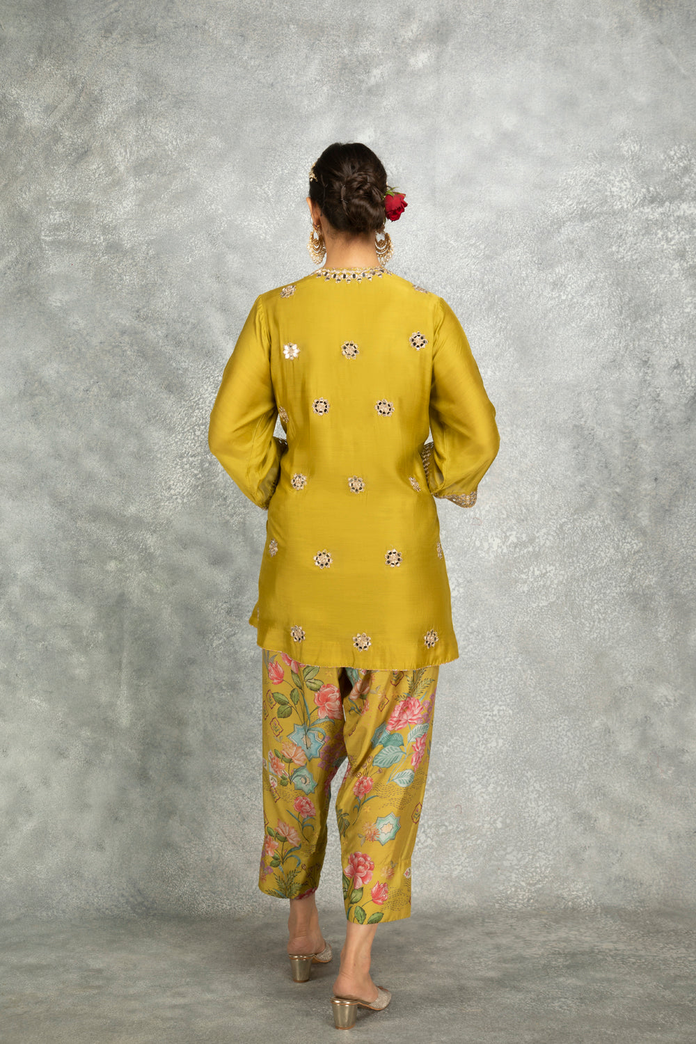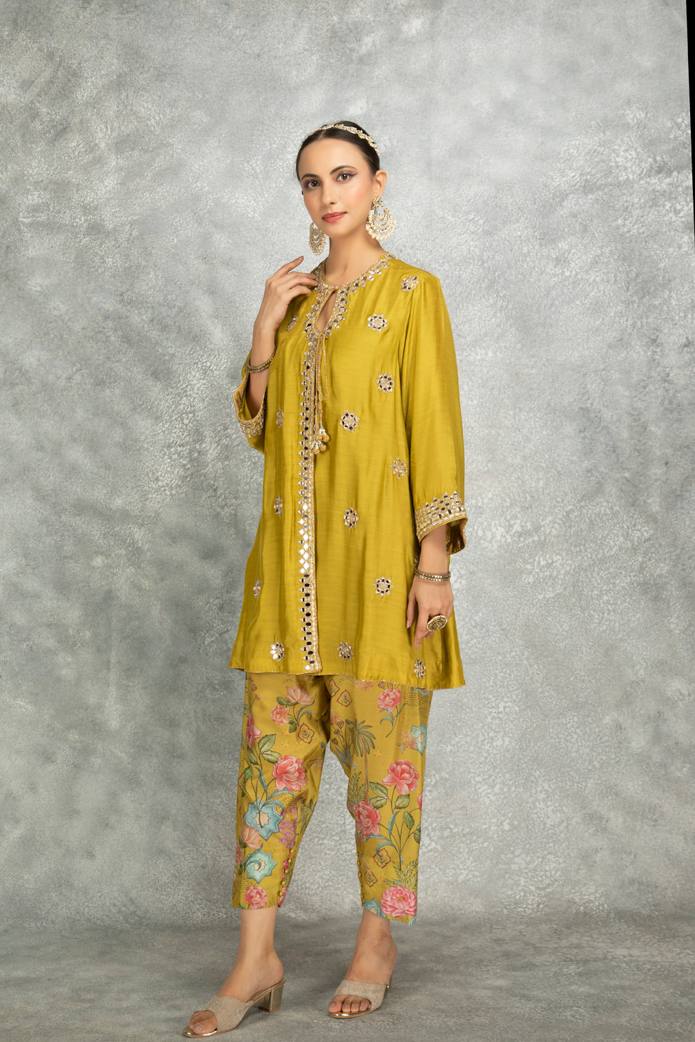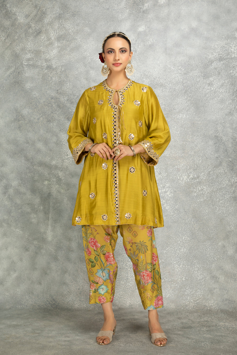 Mustard Green Mirror Embroidered Angrakha With Printed Pants & Dupatta Set Of 3