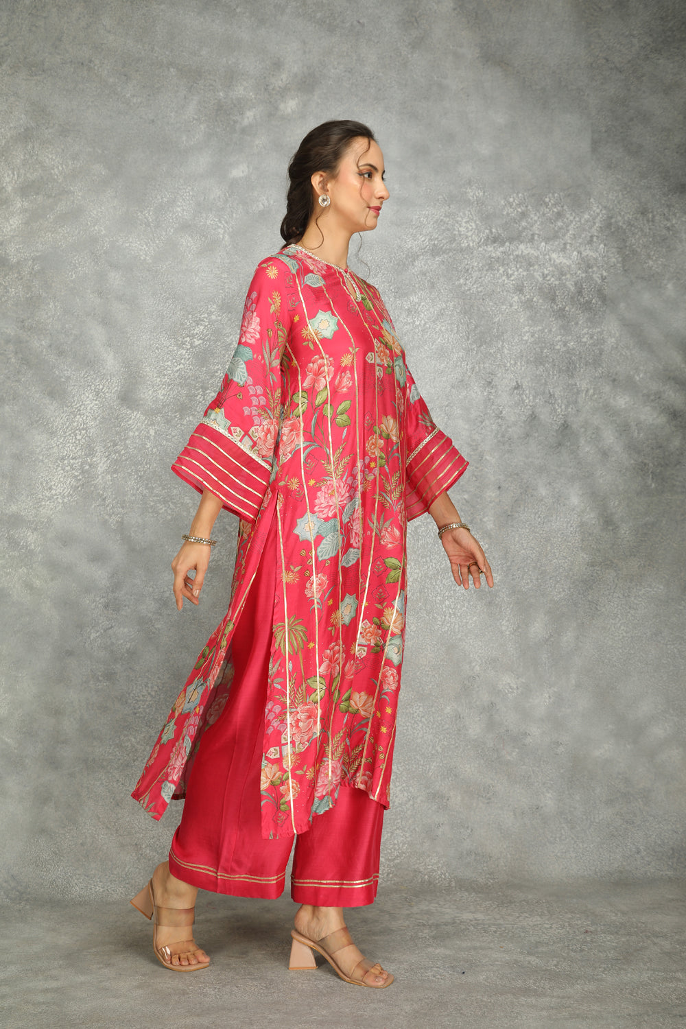 This beautiful floral digital printed kurta showcases detailed work along the neckline, enhanced by intricate gota work that adds a traditional charm. paired with solid pants for a balanced yet elegant look, the set is completed with a soft organza dupatta. ideal for festive occasions or daywear, this ensemble effortlessly blends comfort and style.