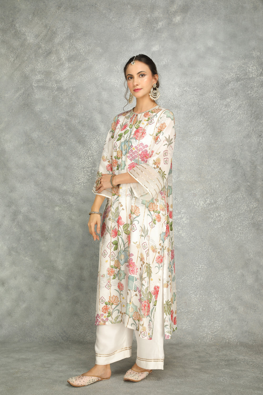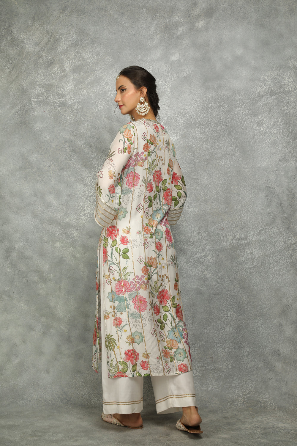 This beautiful floral digital printed kurta showcases detailed work along the neckline, enhanced by intricate gota work that adds a traditional charm. paired with solid pants for a balanced yet elegant look, the set is completed with a soft organza dupatta. ideal for festive occasions or daywear, this ensemble effortlessly blends comfort and style.