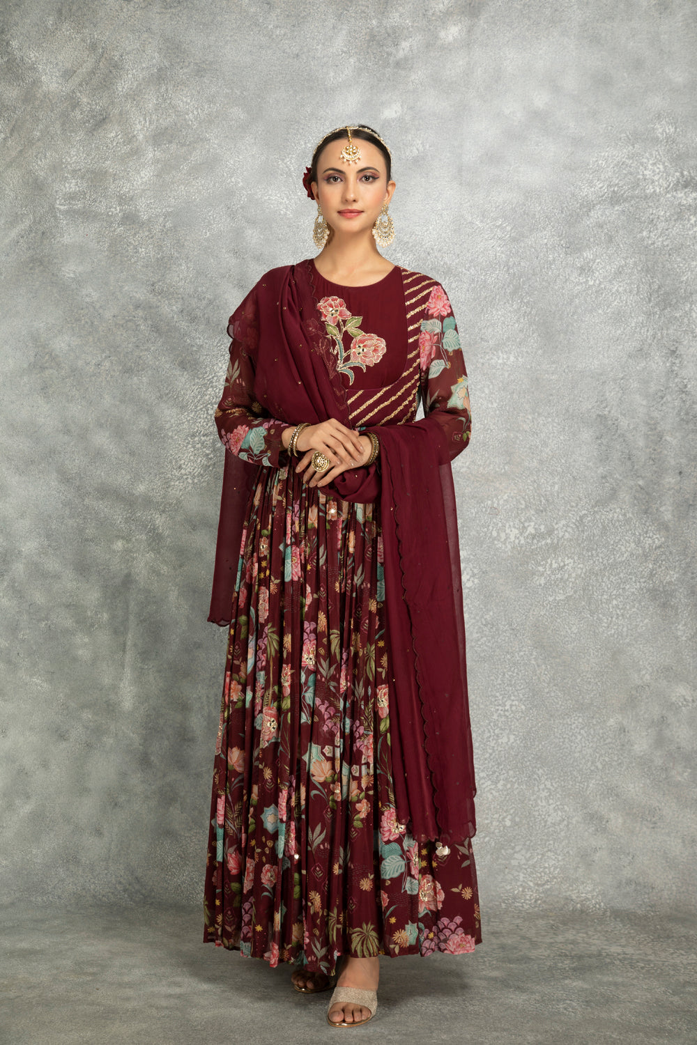 Featuring a Wine floral anarkali with intricate mirror work detailing on soft georgette fabric, paired with a solid churidaar in lycra in, complemented with organza dupatta. Perfect for a sangeet or engagement ceremony, this outfit is best complemented with statement jewelry and heels for a standout, celebratory look.