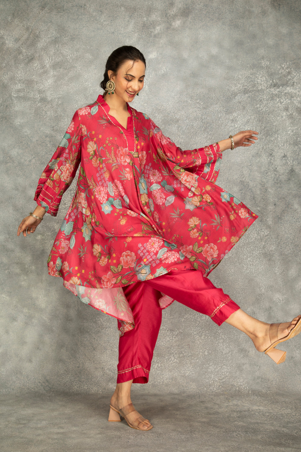 This vibrant hot pink high-low kurta features a vibrant floral print and delicate detailing on the v-neckline, adding a touch of elegance to the design. complemented by solid cotton silk pants, this ensemble offers a perfect blend of style and comfort, making it ideal for festive gatherings or casual occasions