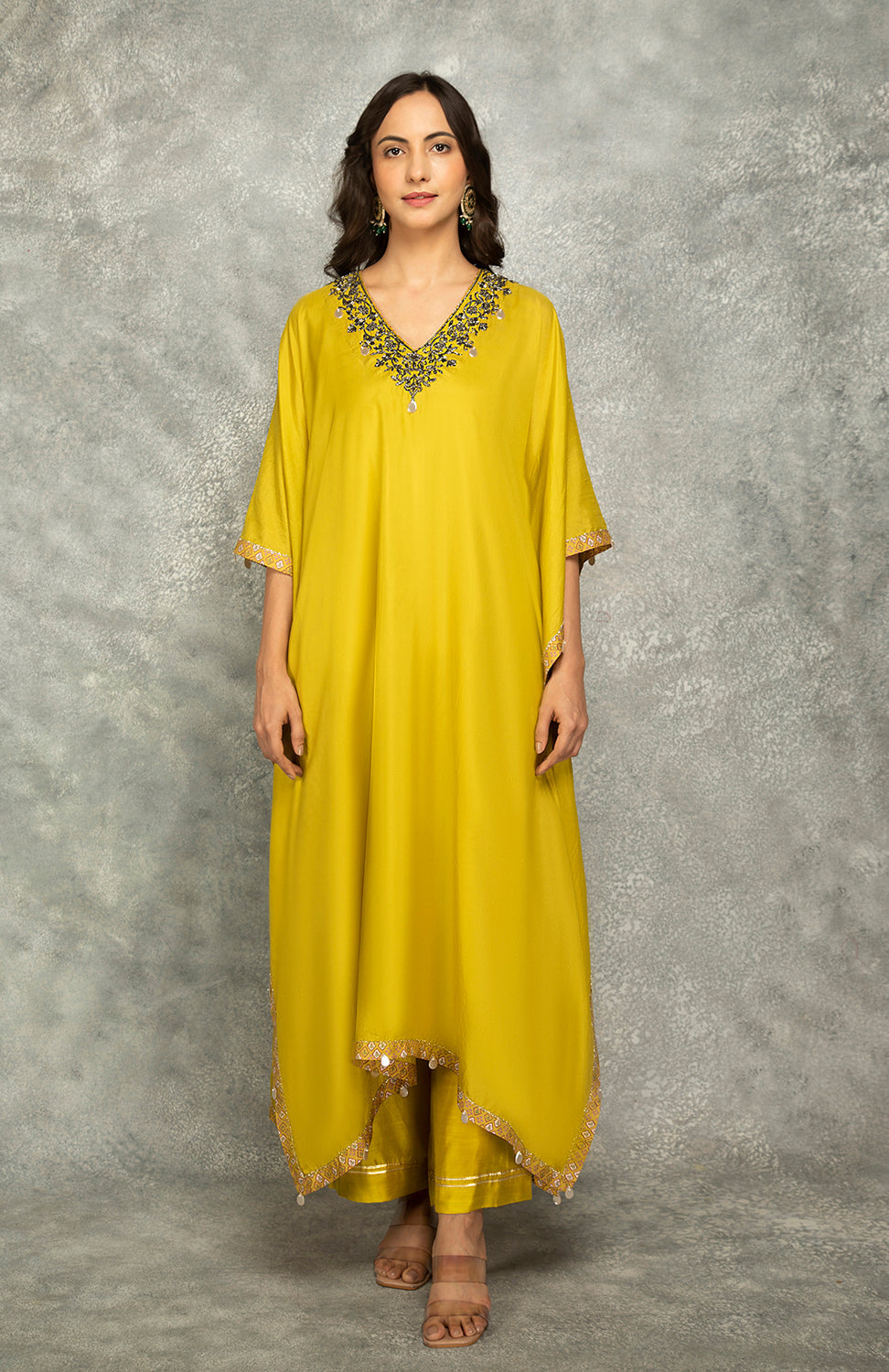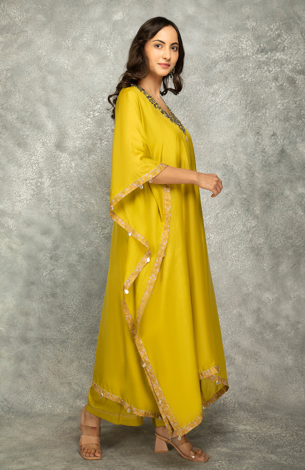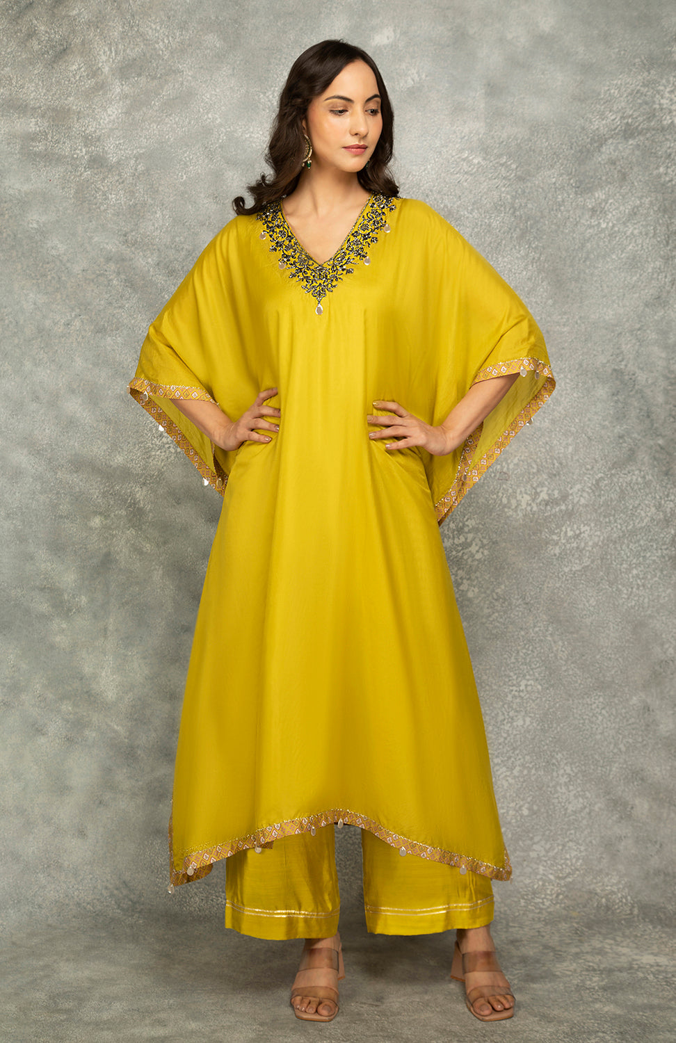 This elegant mustard green silk kaftaan features exquisite oxidized hand embroidery on the neckline, offering a luxurious touch of craftsmanship. the kaftaan is further enhanced by printed facing along the sides, subtly highlighting the intricate work. paired with soft modal silk pants adorned with detail work at the hem.