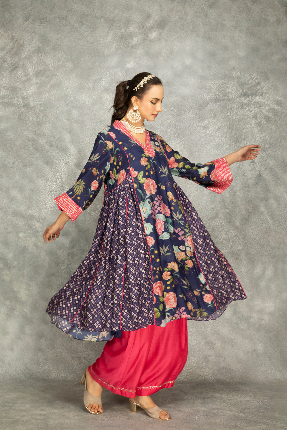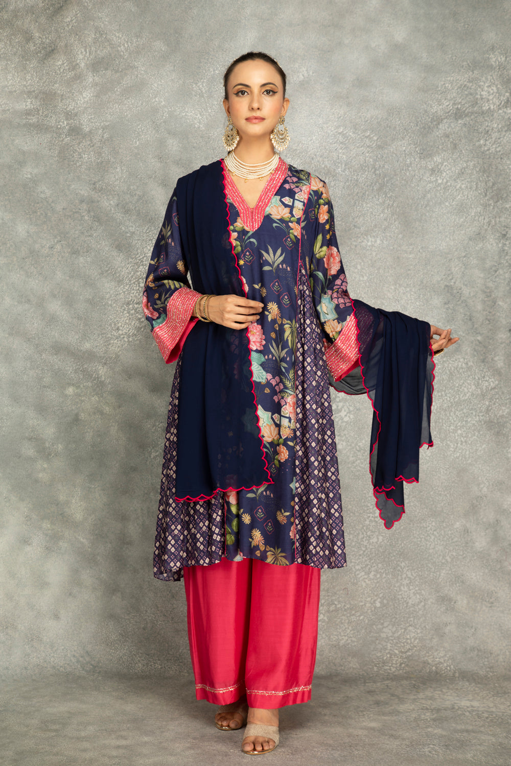 This vibrant side panel kurta features a striking digital print with contrasting colored fabric, beautifully detailed at the neckline and sleeves. the side panels showcase a delicate butti-butti pattern, adding charm to the design, all crafted from soft cotton silk for a luxurious feel. paired with contrasting cotton silk pants and a georgette scalloped dupatta, making it perfect for festive occasions or celebratory gatherings.