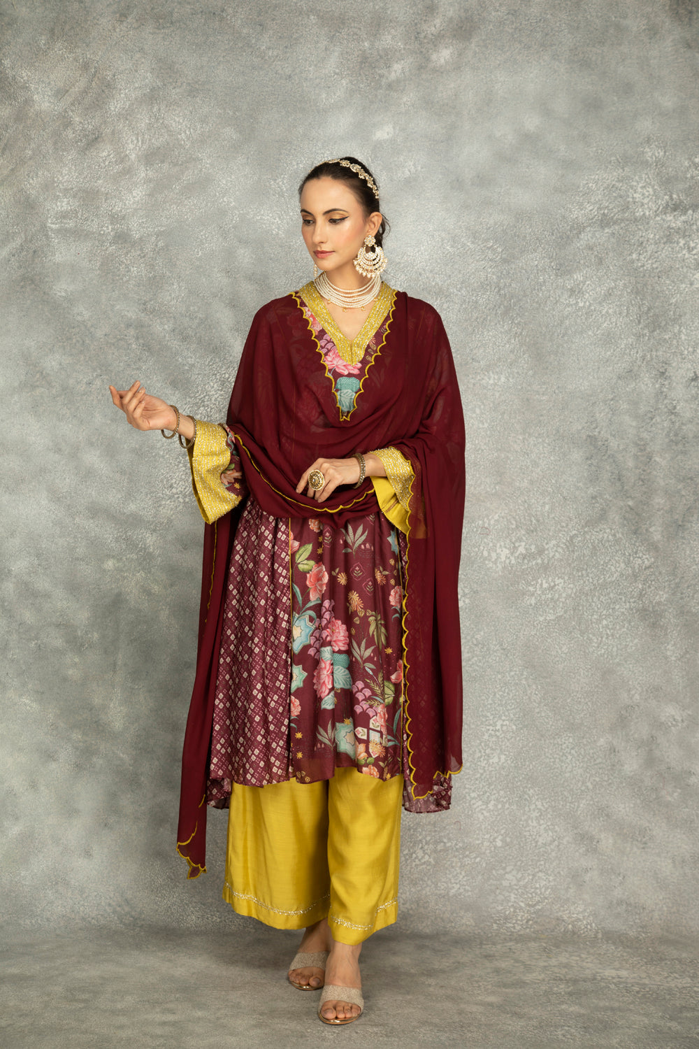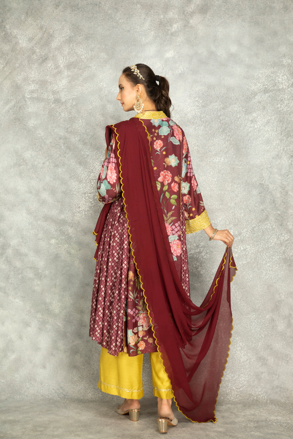 Old Wine Side Panel Buti Kurta With Scalloping Dupatta