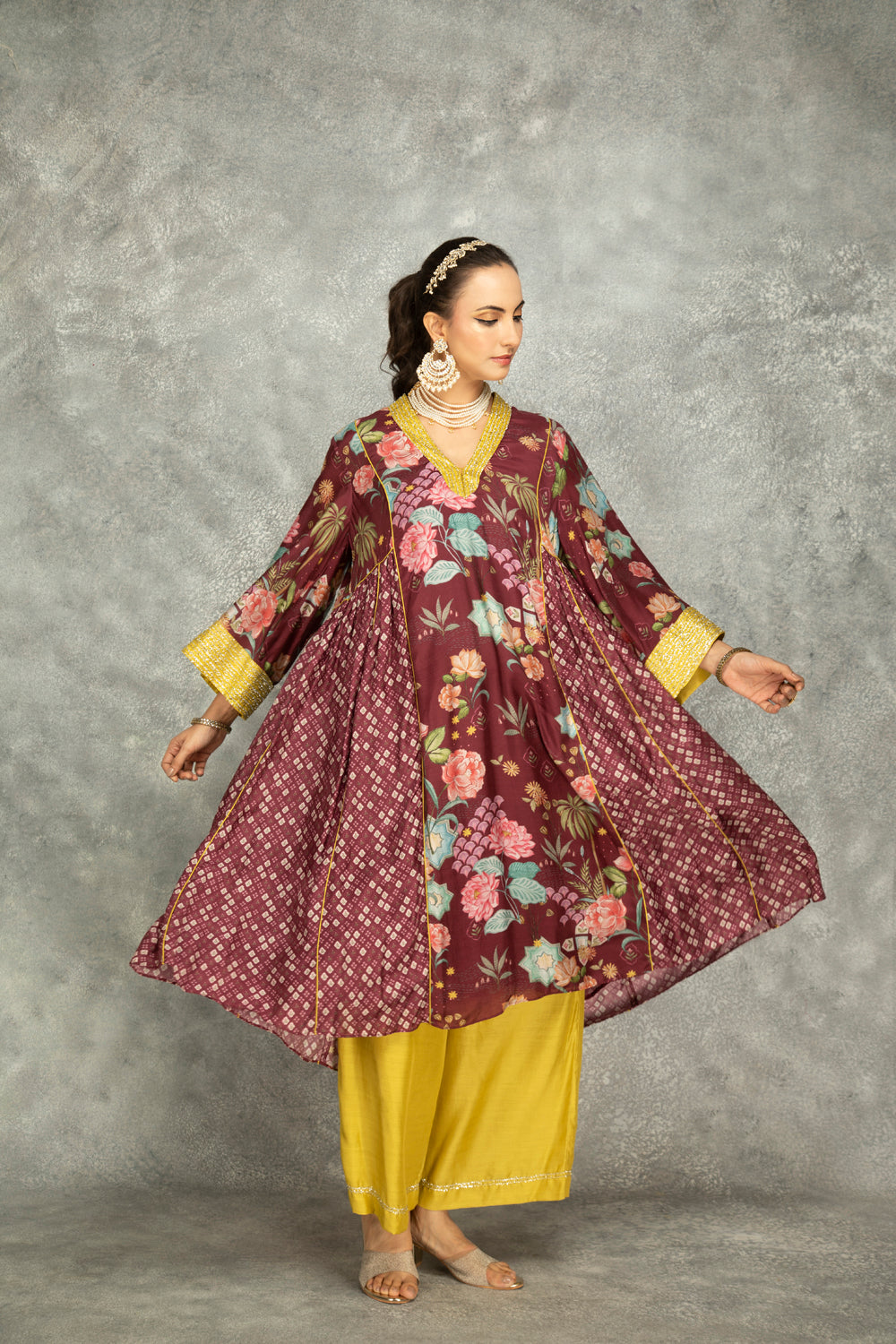 This vibrant side panel kurta features a striking digital print with contrasting colored fabric, beautifully detailed at the neckline and sleeves. the side panels showcase a delicate butti-butti pattern, adding charm to the design, all crafted from soft cotton silk for a luxurious feel. paired with contrasting cotton silk pants and a georgette scalloped dupatta, making it perfect for festive occasions or celebratory gatherings.