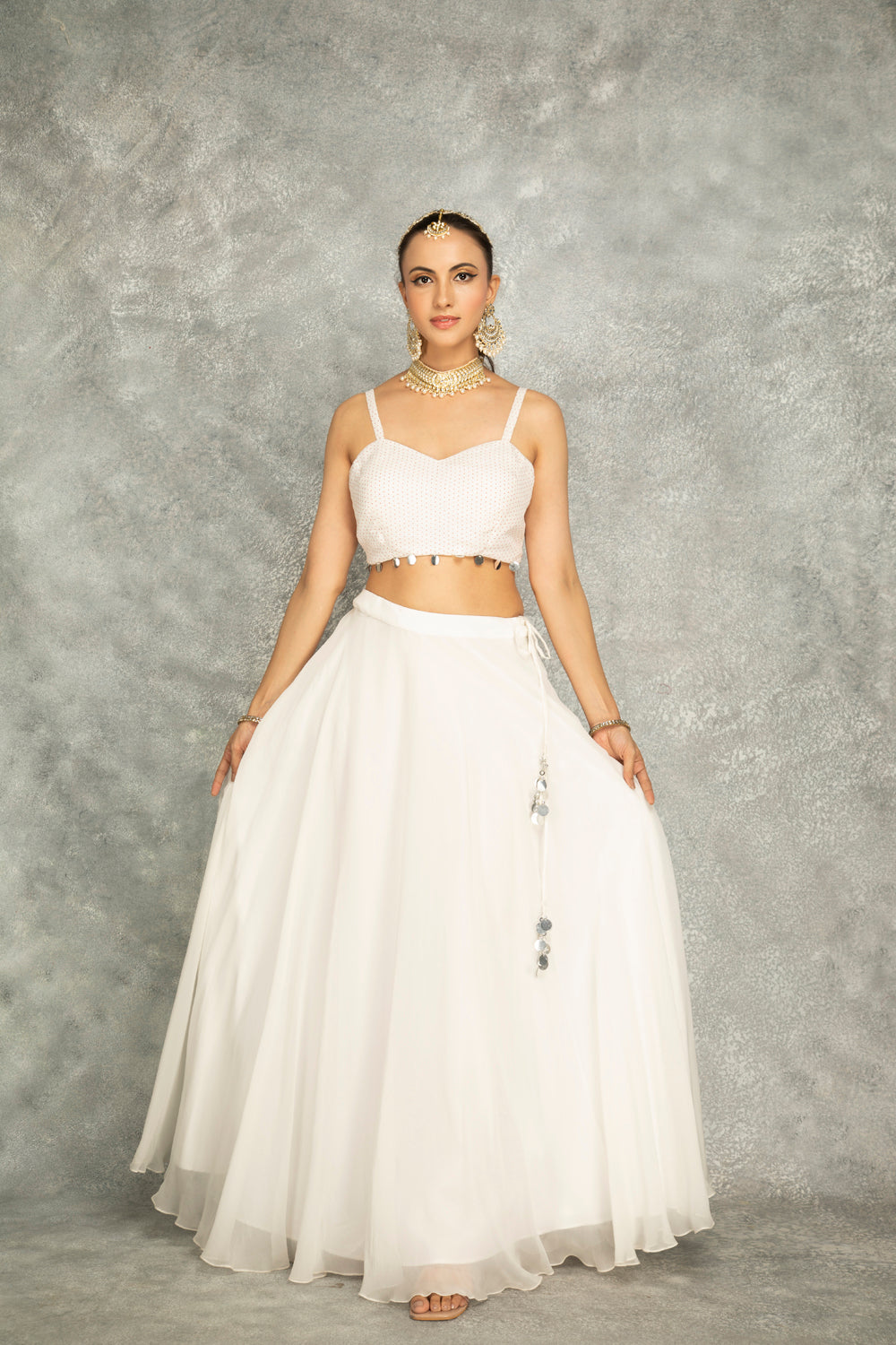 Featuring a white floral printed cape crafted from airy organza, adding an ethereal touch to the look. it comes with a chic polka dot crop top bustier in soft georgette, perfectly paired with a flowy organza skirt. the combination creates a mesmerizing silhouette, ideal for festive occasions. the intricate mirror work adds a subtle sparkle, making this outfit perfect for standing out at weddings, receptions, or grand celebrations.