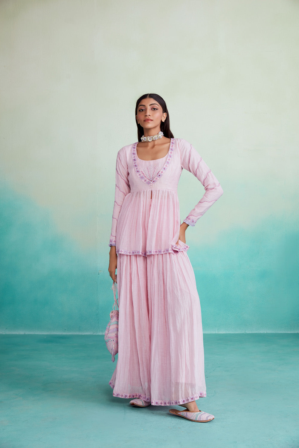 Introducing our exquisite rosalyn sharara set in orchid pink - a blend of elegance and tradition! this set features a charming peplum style kurta, adorned with delicate hand embroidery on the yoke and long sleeves, inspired by the rich heritage of traditional kutchi embroideries. the set also includes a beautifully flairy and micro pleated sharara, complemented by a hand-embroidered border that adds a touch of drama to your look. embrace the allure of cultural craftsmanship with this stunning ensemble that promises to make you stand out on any occasion.