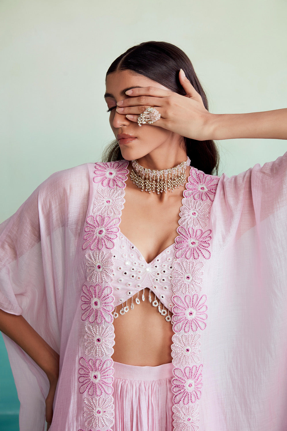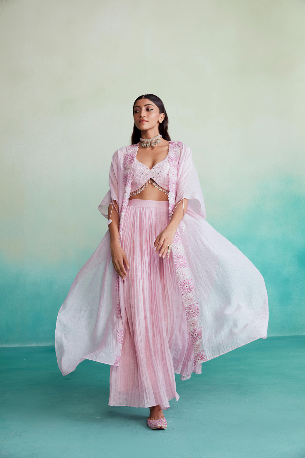 Introducing the fleuris jacket set in orchid pink – a true delight for your senses! this exquisite set is crafted in fine chanderi fabric, featuring a beautifully hand-embroidered crop top and jacket. the mirror work blouse adds a touch of elegance to the ensemble.