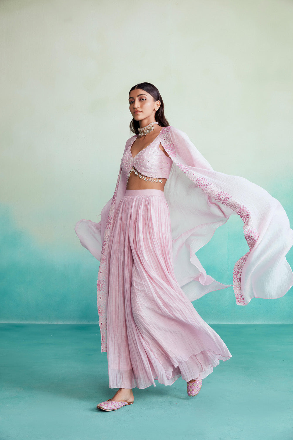 the jacket boasts intricate hand-embroidered floral motifs, taking over 100 hours to complete, ensuring a truly unique and exquisite design. paired with a micropleated sharara, this set is a perfect blend of comfort and style.