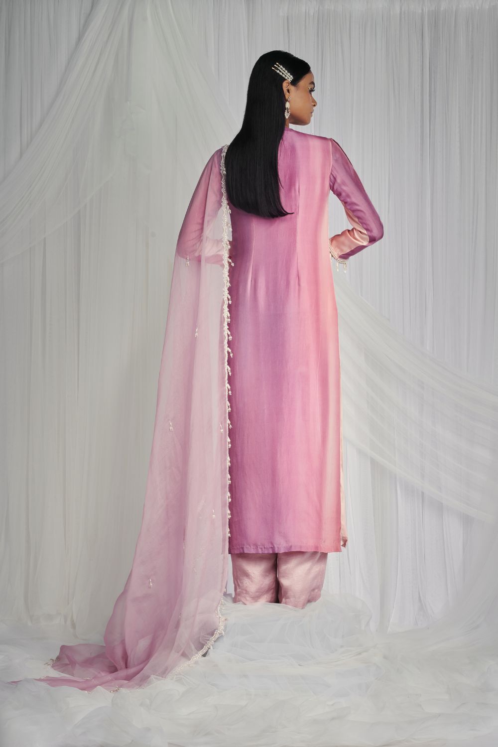 Ombre kurta accented with our pearl mala paired with pure organza dupatta with heavy hand worked pearl tassels on the hem and background.