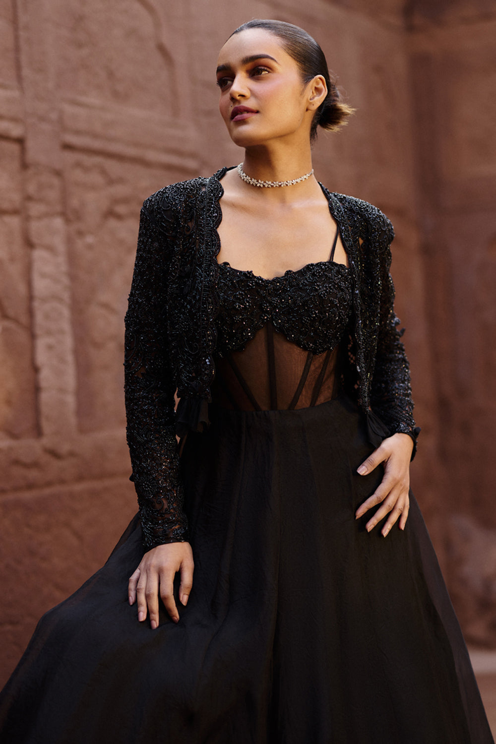 A captivating black corset gown adorned with intricate embellishments, accompanied by a short jacket boasting stunning embroidery and meticulous craftsmanship, showcasing unparalleled elegance and sophistication.