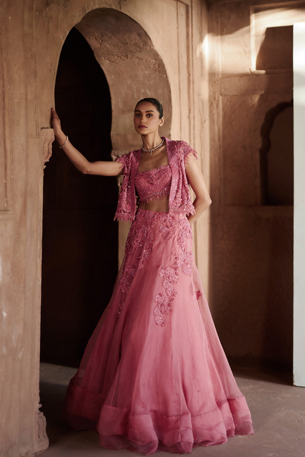 An enchanting brink pink lehenga featuring asymmetric linear floral embroidery gracing the skirt, accompanied by a fully embroidered blouse. the ensemble is elevated with a short, intricately crafted jacket boasting cut sleeves, exuding grace and allure.