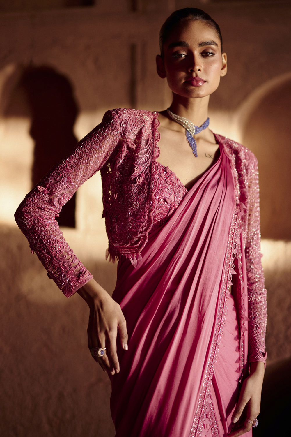 A luxurious brink pink draped saree, featuring a sleek fabric texture and adorned with intricate embroidery on the blouse and embellished hems on the saree. paired gracefully with a short, intricately embroidered jacket, epitomising elegance and allure.