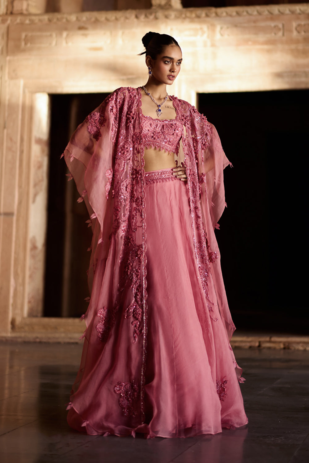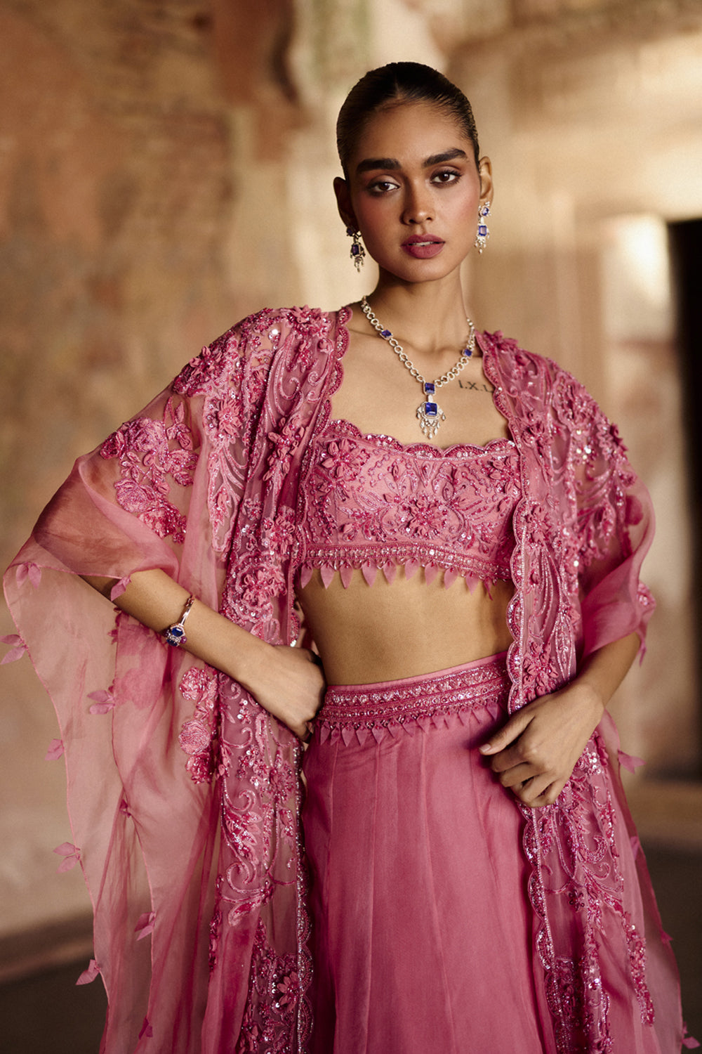 Embrace timeless elegance with our brink pink lehenga ensemble - where a flared skirt meets a free-flowing embellished cape, perfectly complemented by a fully embroidered bustier blouse.