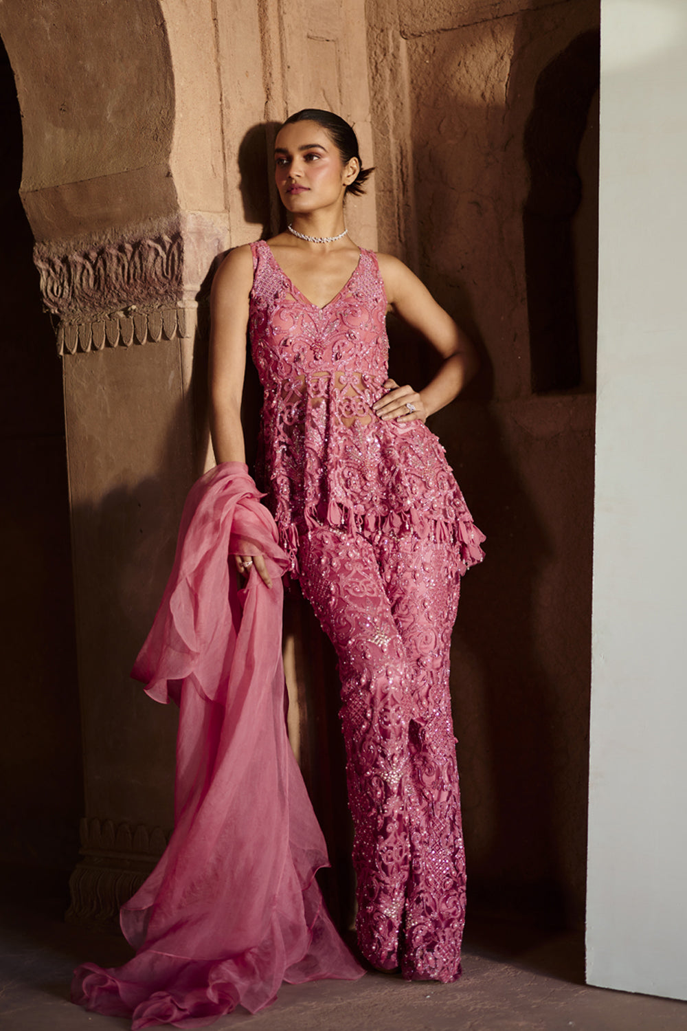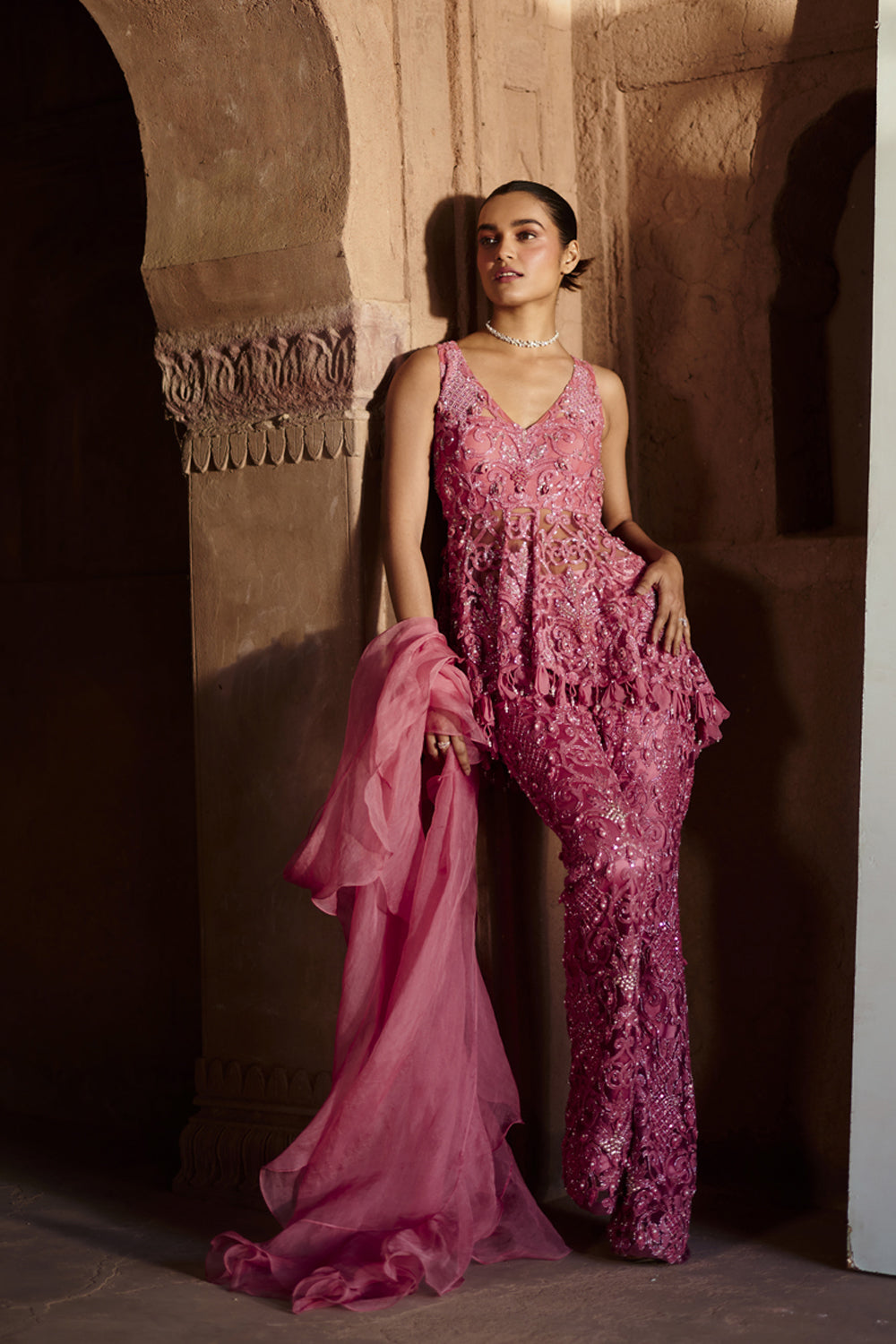 A stunning brink pink peplum paired with boot-cut pants, both intricately embroidered with a floral pattern showcasing exquisite craftsmanship. the ensemble is elegantly finished with a ruffle-edged dupatta.