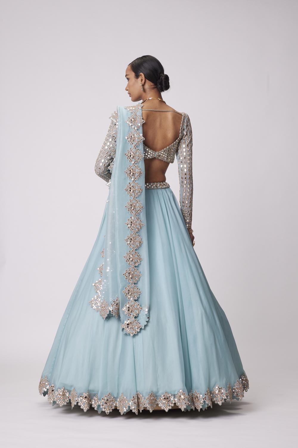 Powder blue organza real hand-cut mirror embroidered lehenga and dupatta clubbed with a heavily mirror embellished full sleeve blouse.