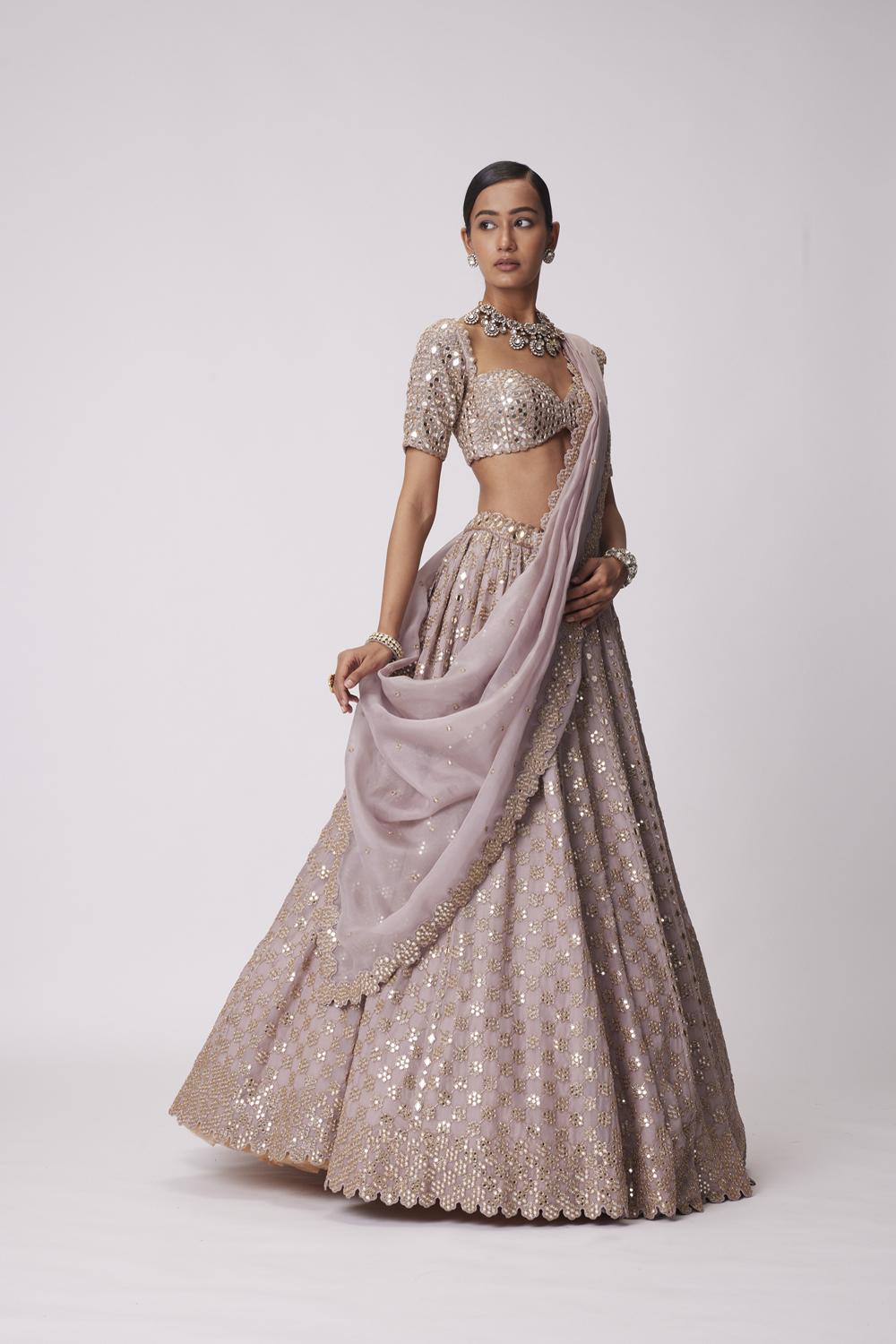Ash Pink Mirror Flower Embroidered Lehenga Set