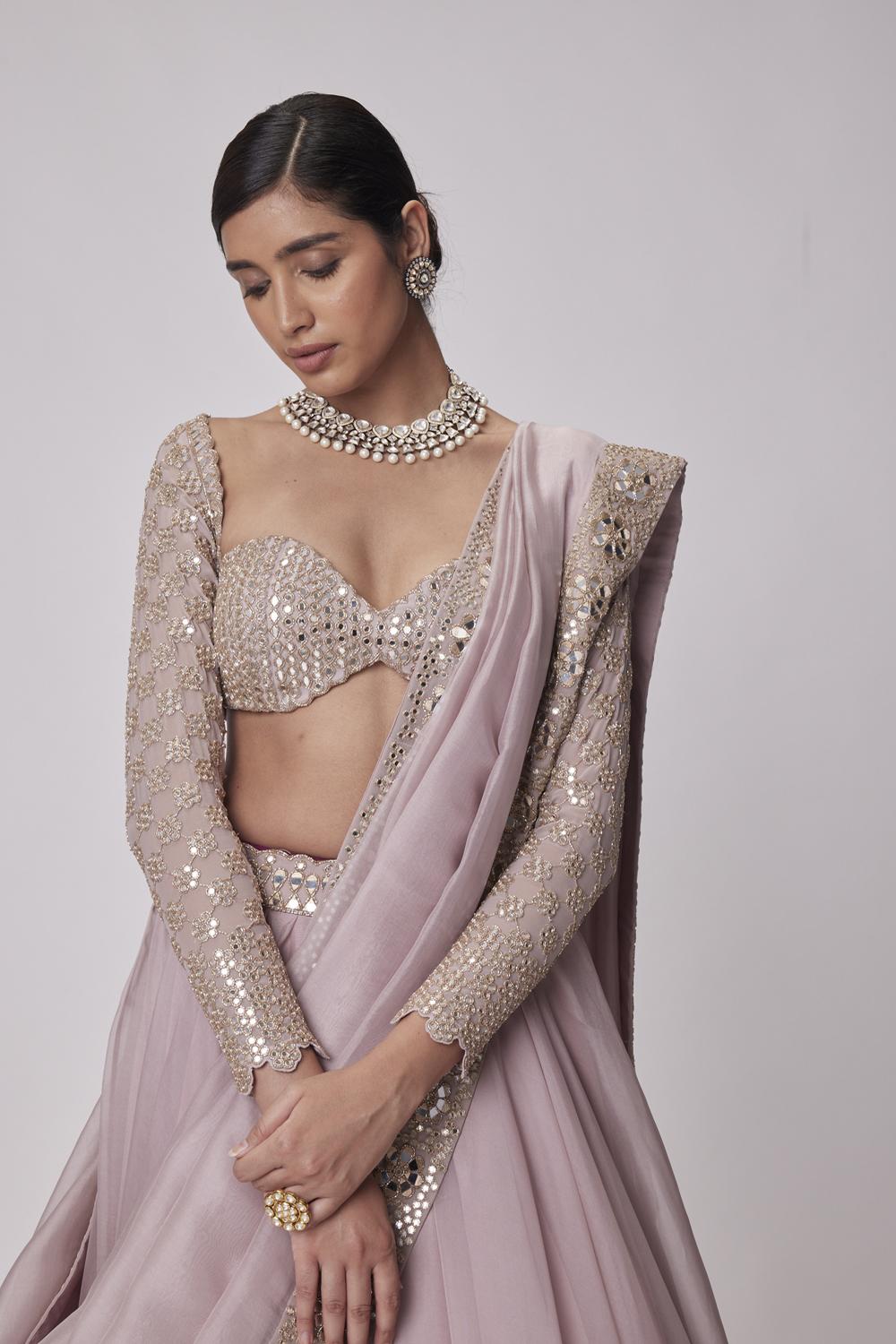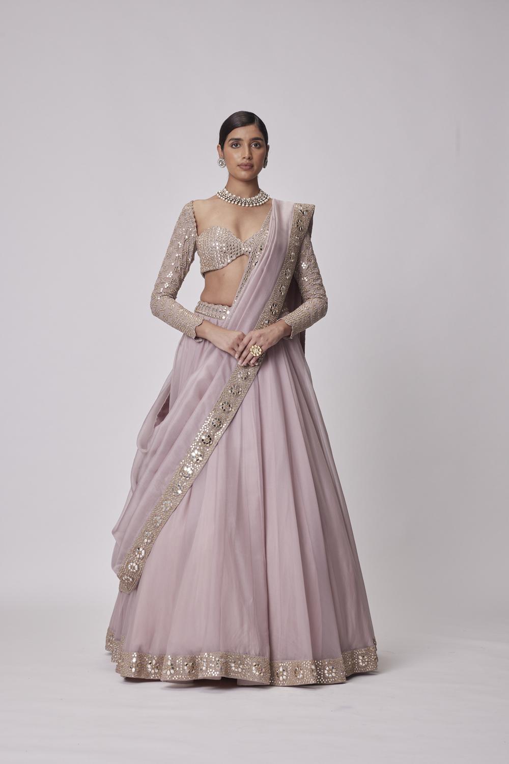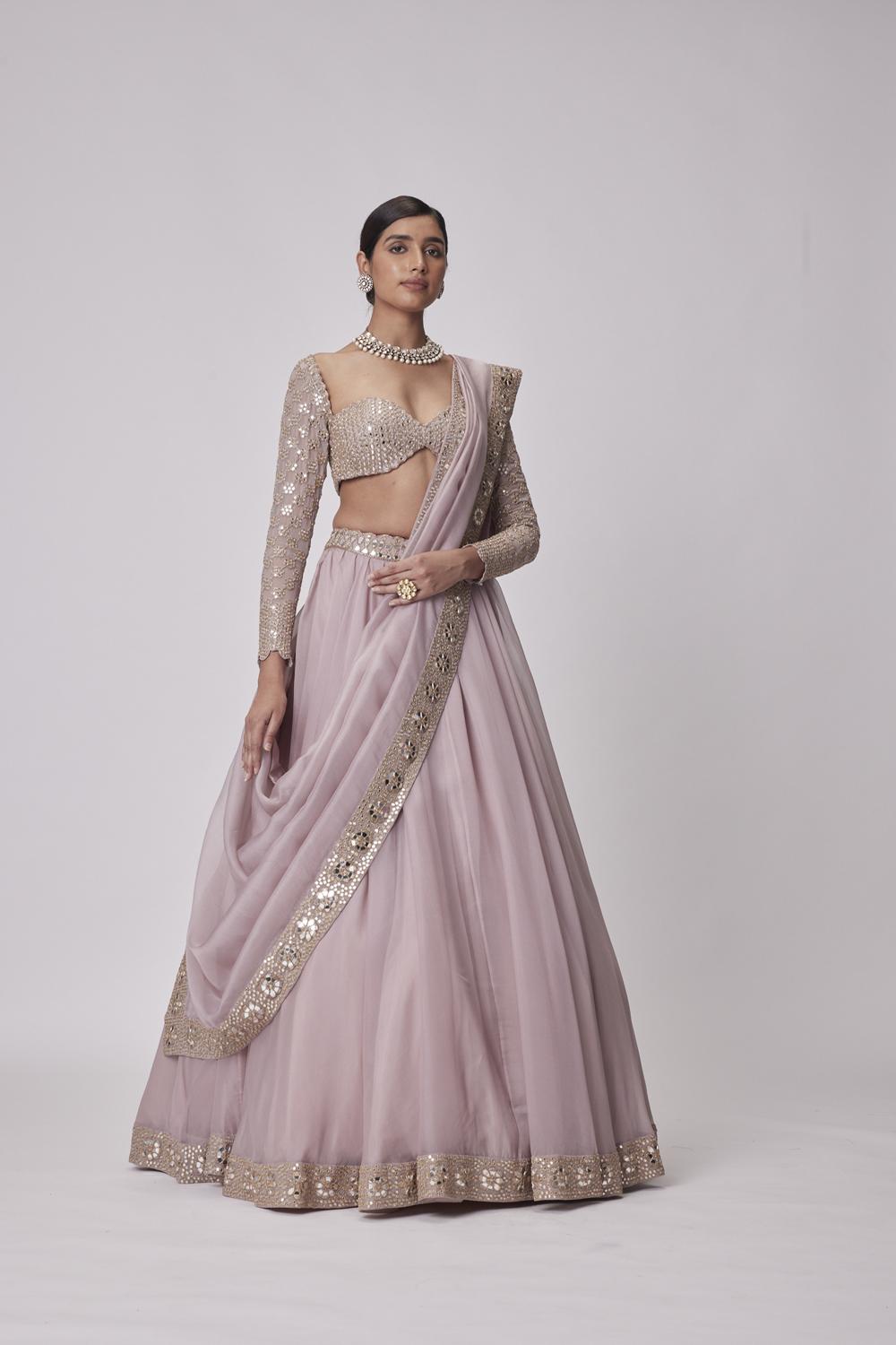 Ash pink organza lehenga and dupatta clubbed with real hand cut mirror embroidered full sleeve blouse.