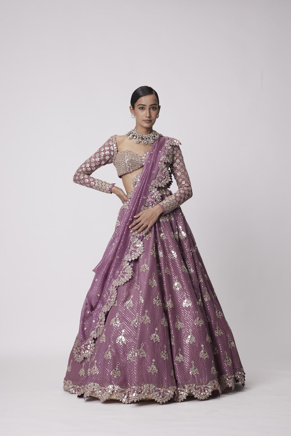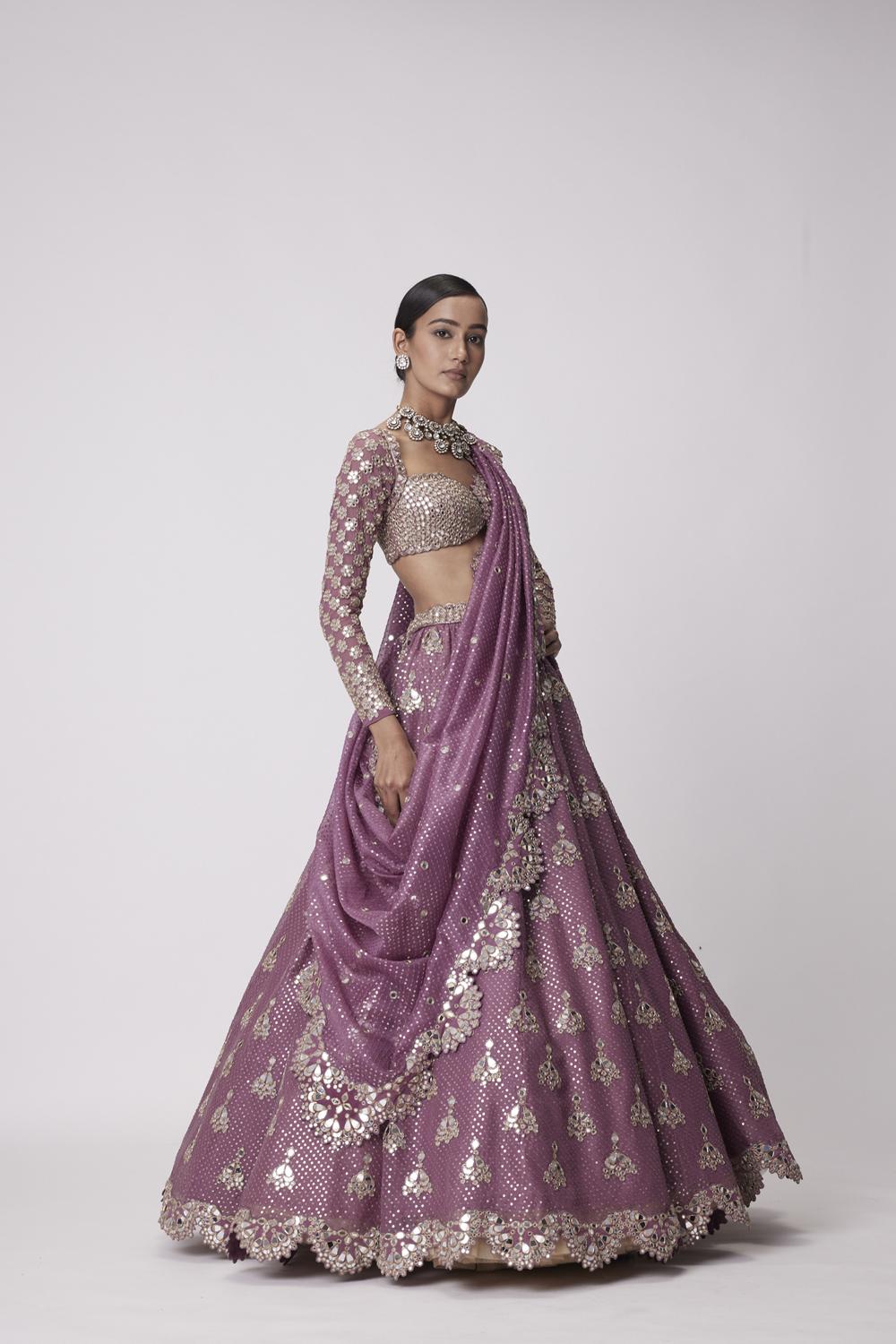 Mud mauve sequin and flower embroidered lehenga and dupatta clubbed with real hand cut mirror embroidered fullsleeve blouse.