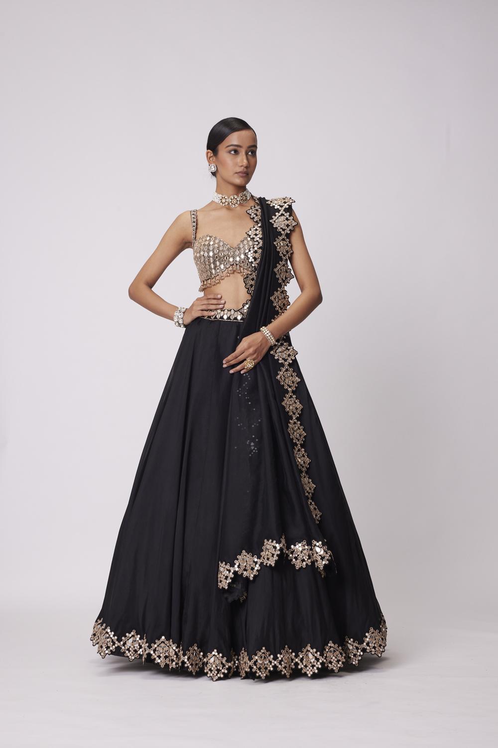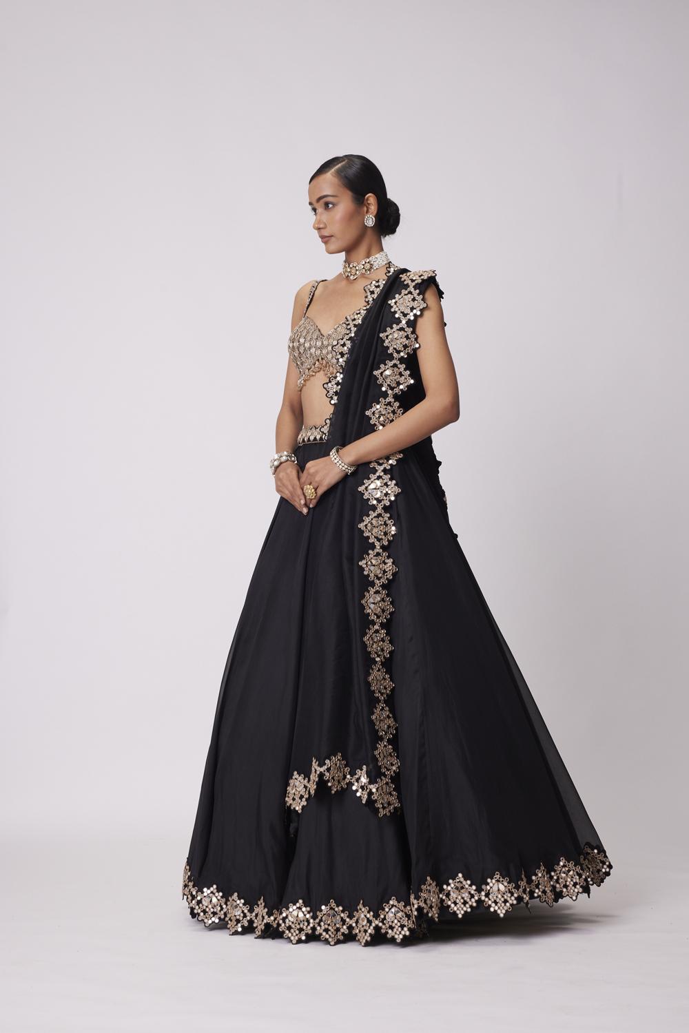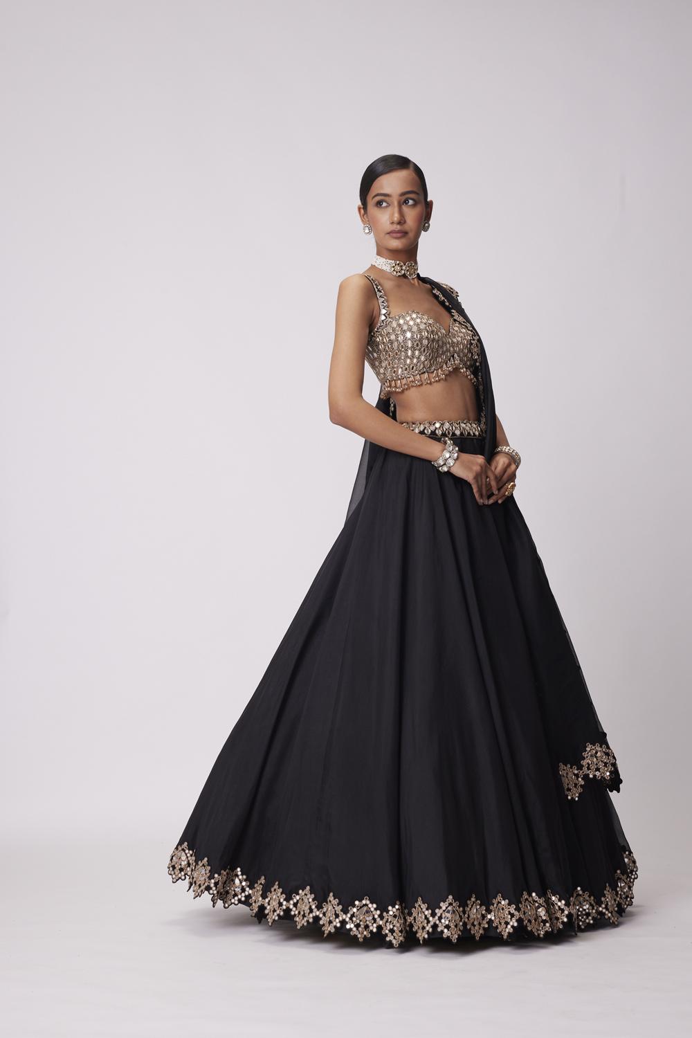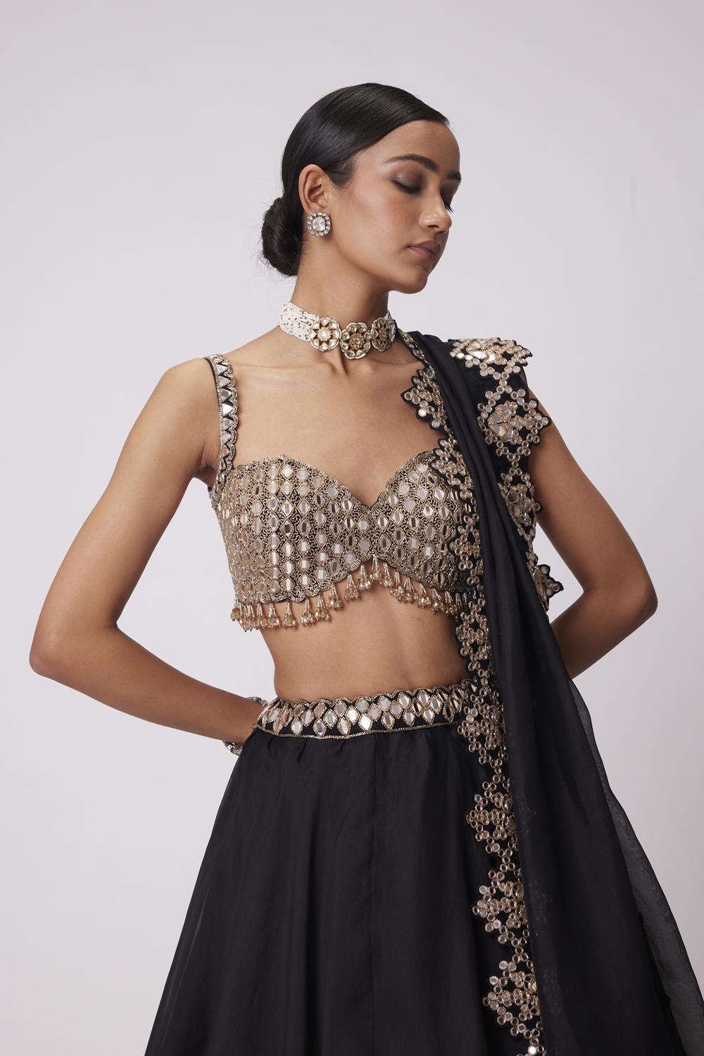 Black organza mirror embroidered lehenga and dupatta clubbed with real hand cut mirror embroidered sleeveless blouse.
