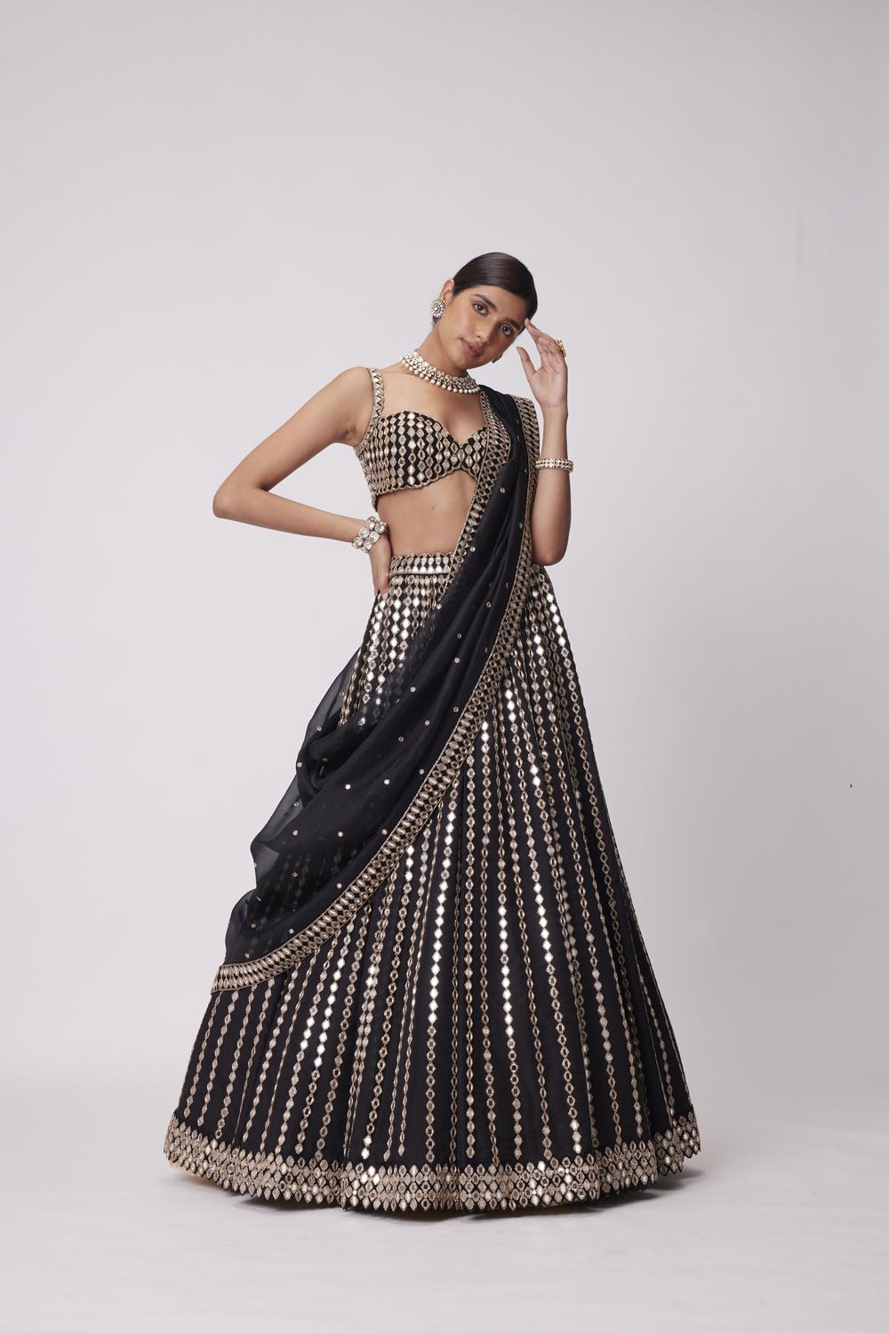 Black linear mirror embroidered lehenga and dupatta clubbed with real hand cut mirror embroidered sleeveless blouse.