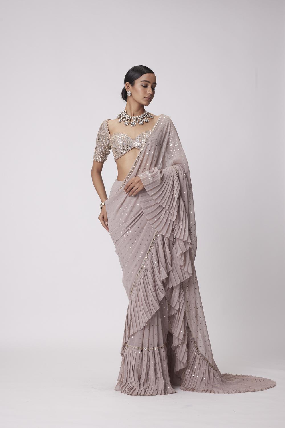 Ash pink georgette saree with frill detailing clubbed with real hand cut mirror embroidered elbow sleeve length blouse.