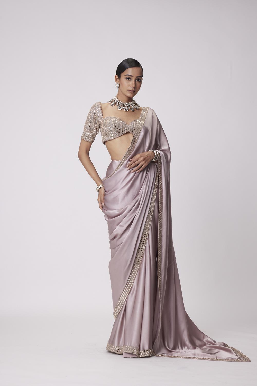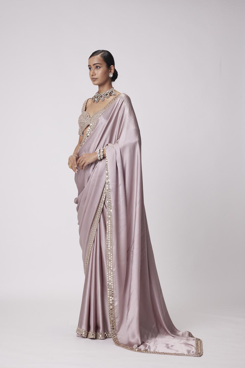 Aash pink satin saree clubbed with real hand cut mirror embroidered elbow sleeve length blouse.