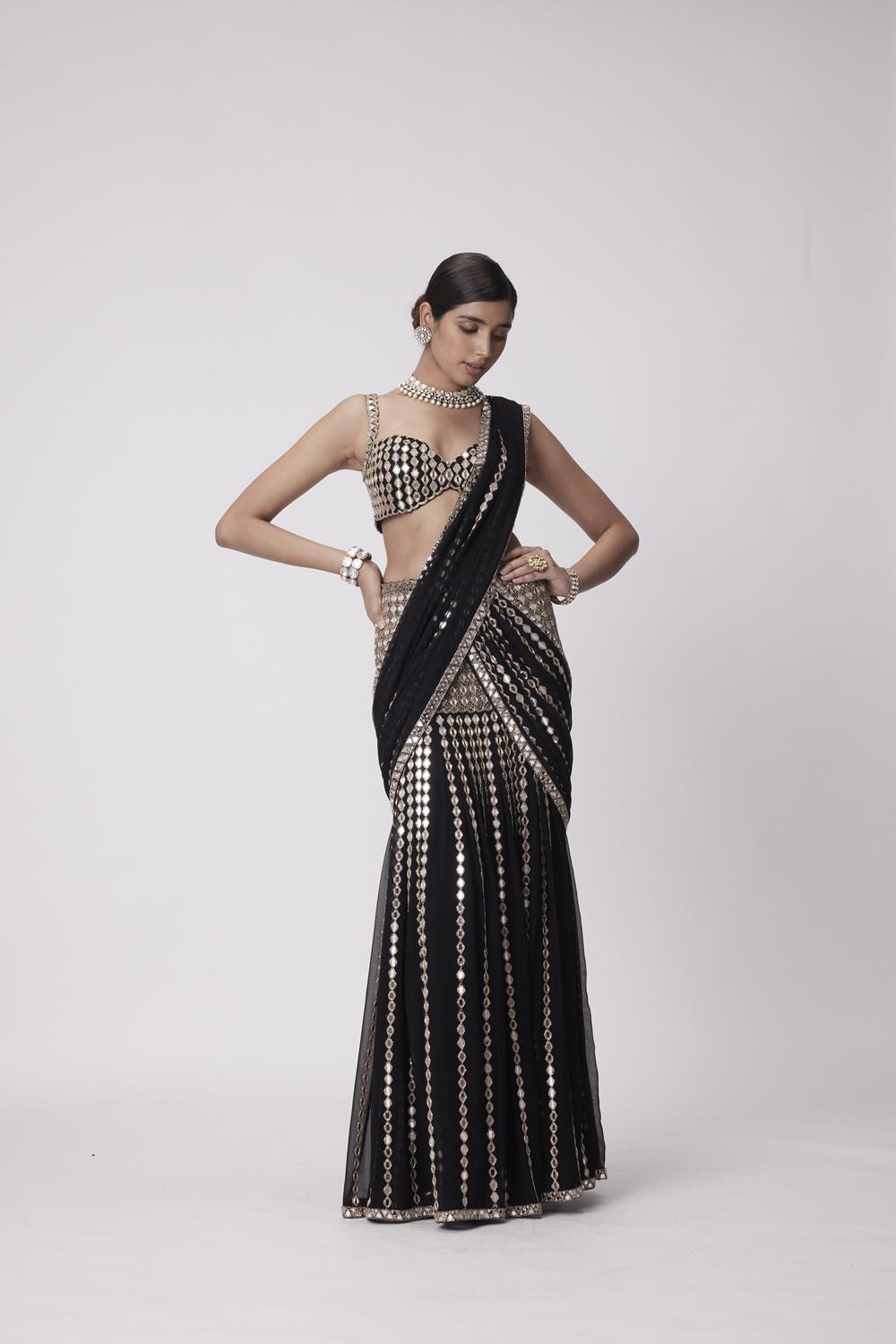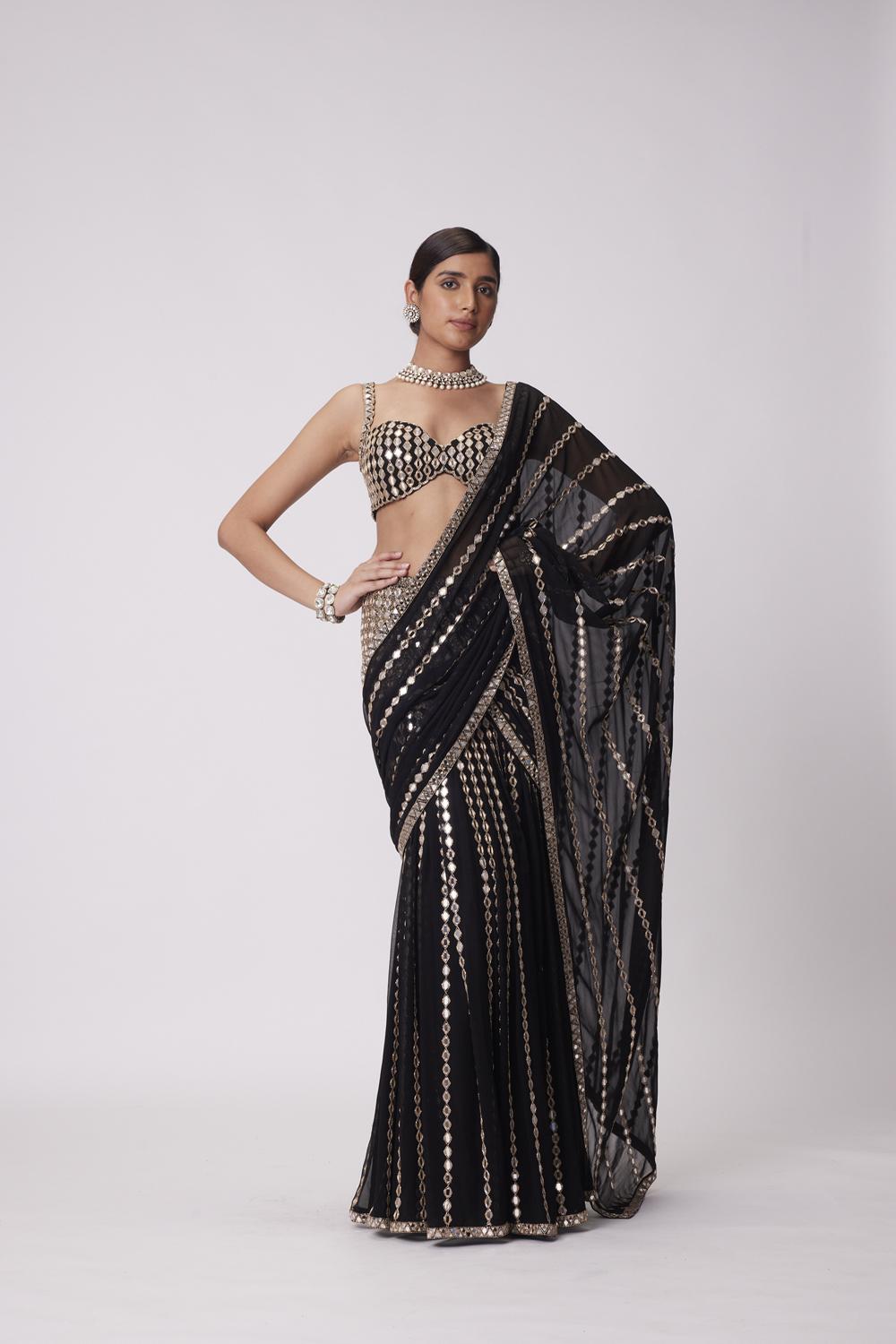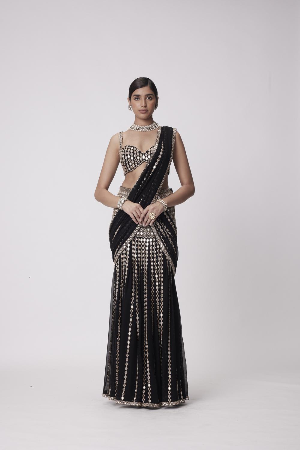 Black georgette pre draped hand embroidered saree with real hand cut mirror embroidered sleeveless blouse.
