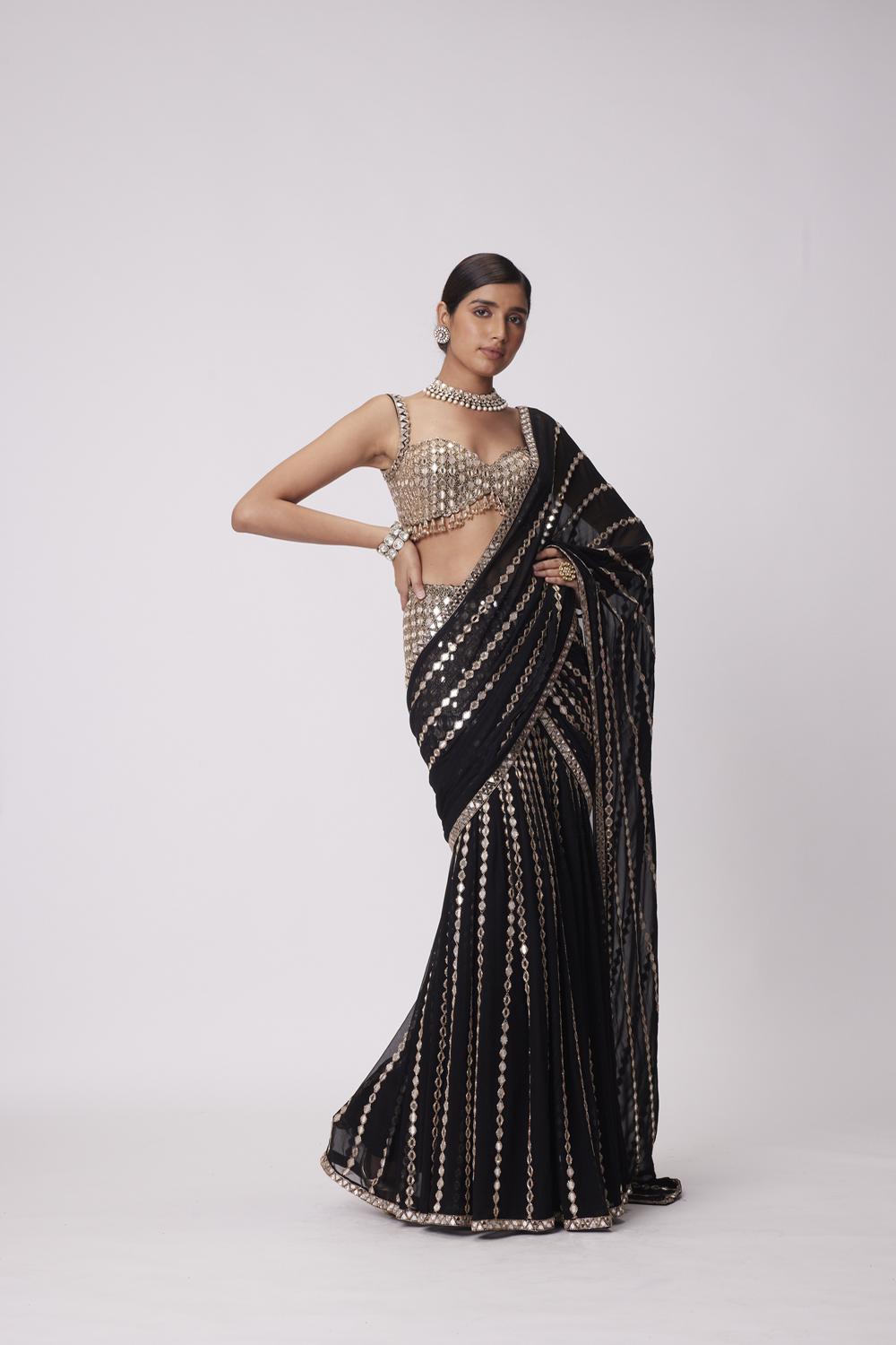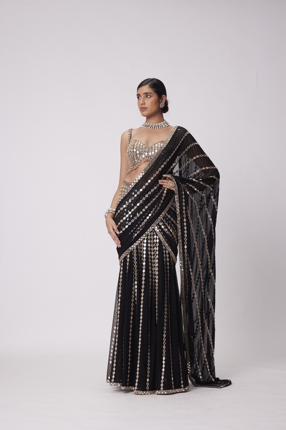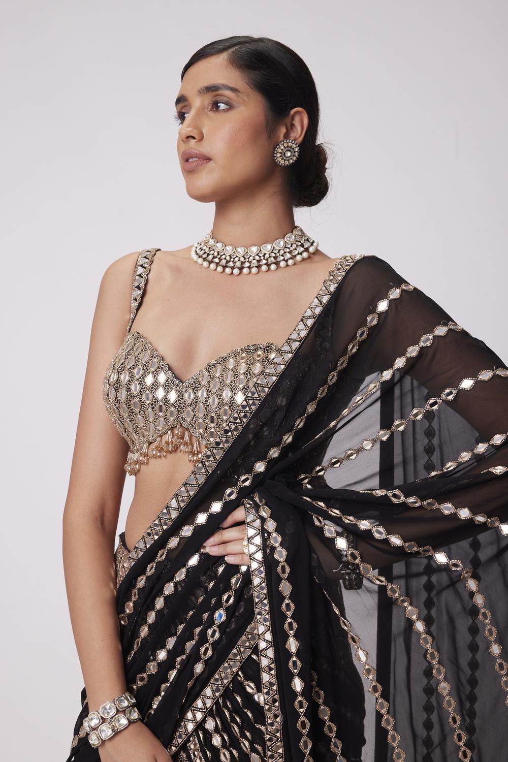 Black georgette pre draped hand embroidered saree with real hand cut mirror embroidered sleeveless blouse.