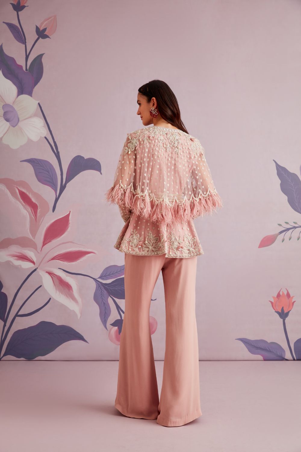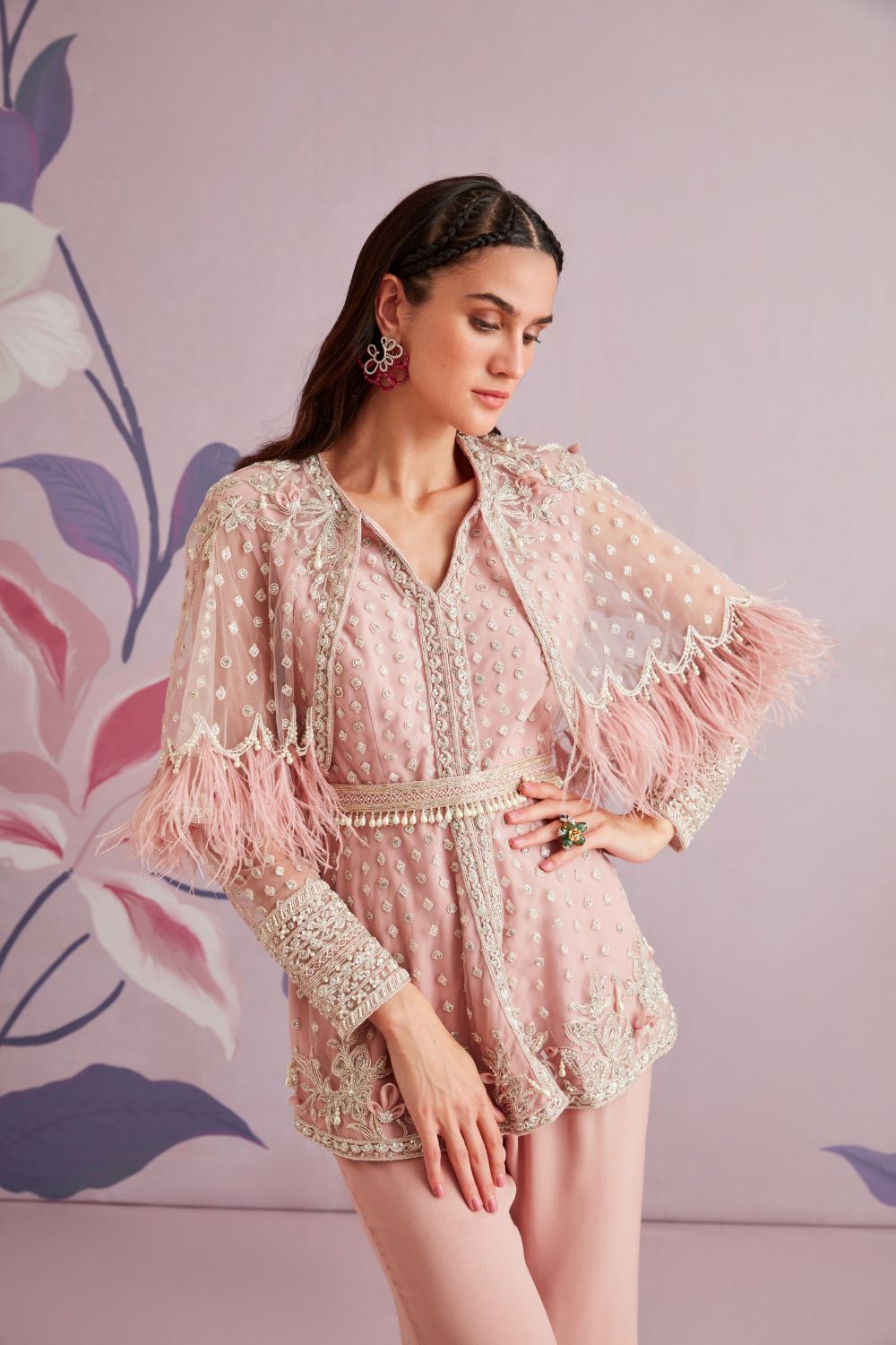 Embroidered net cape peplum and georgette pants paired with belt.