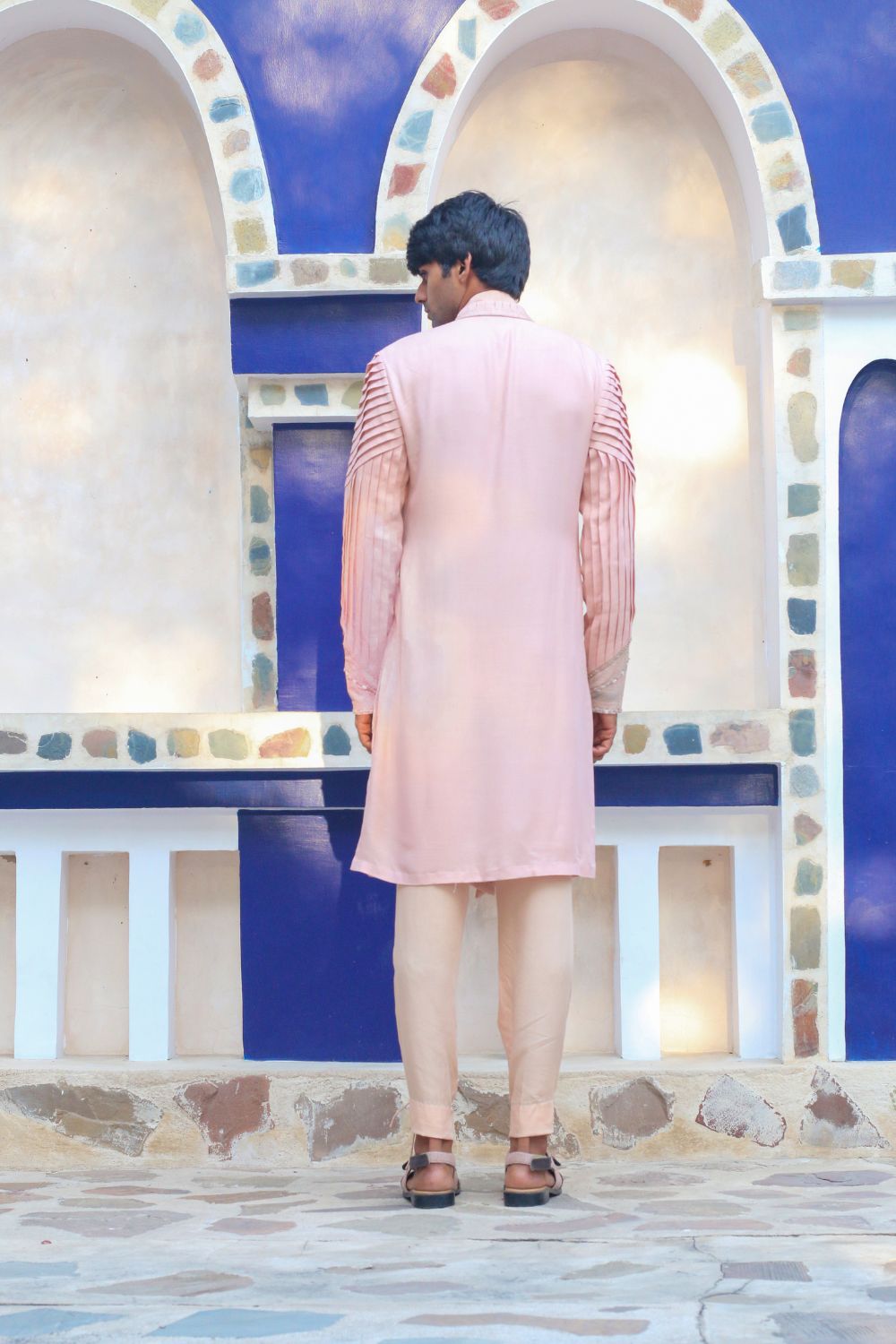 Salmon pink overlay in our signature hand crafted fabric with deep collared shirt and zeera crape pants