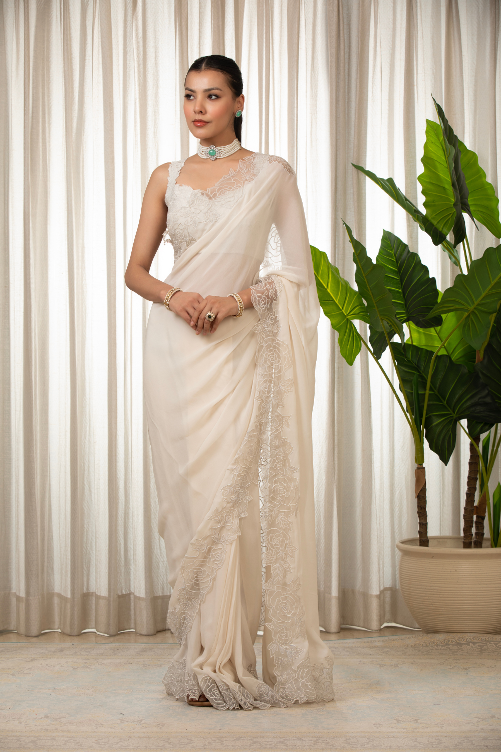It consists georgette saree with detailed organza cutwork all over.It is Paired with chanderi blouse and Peticoat.