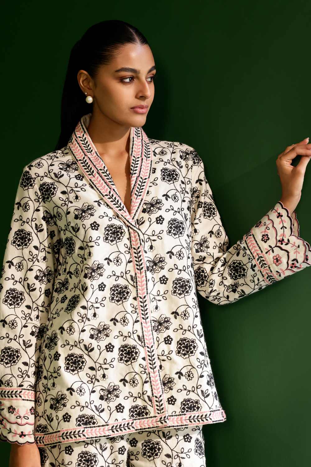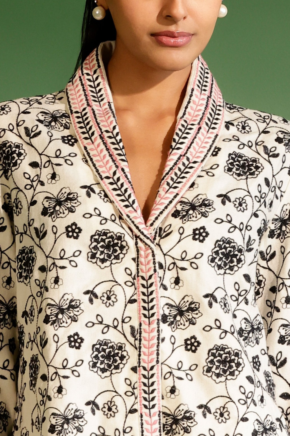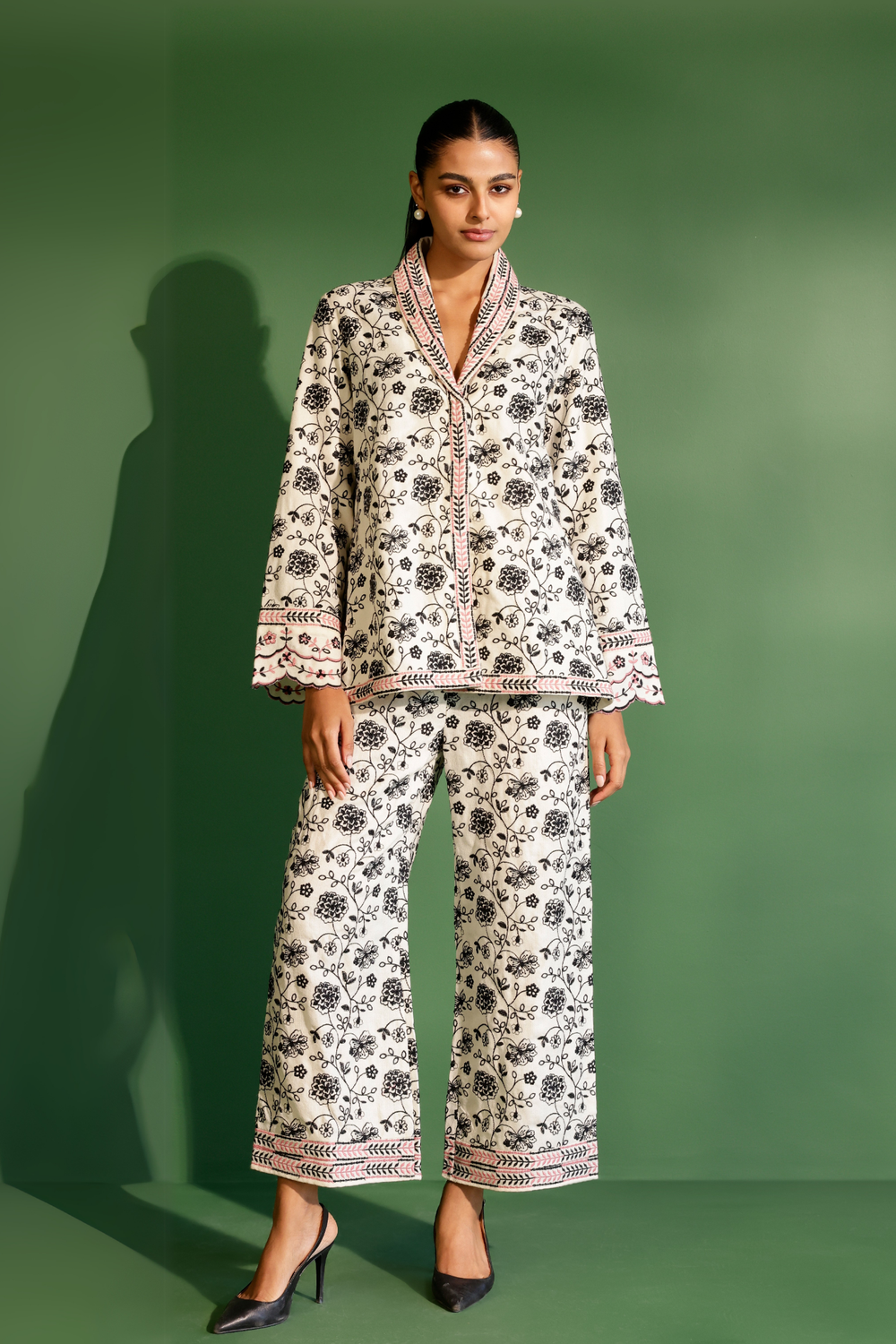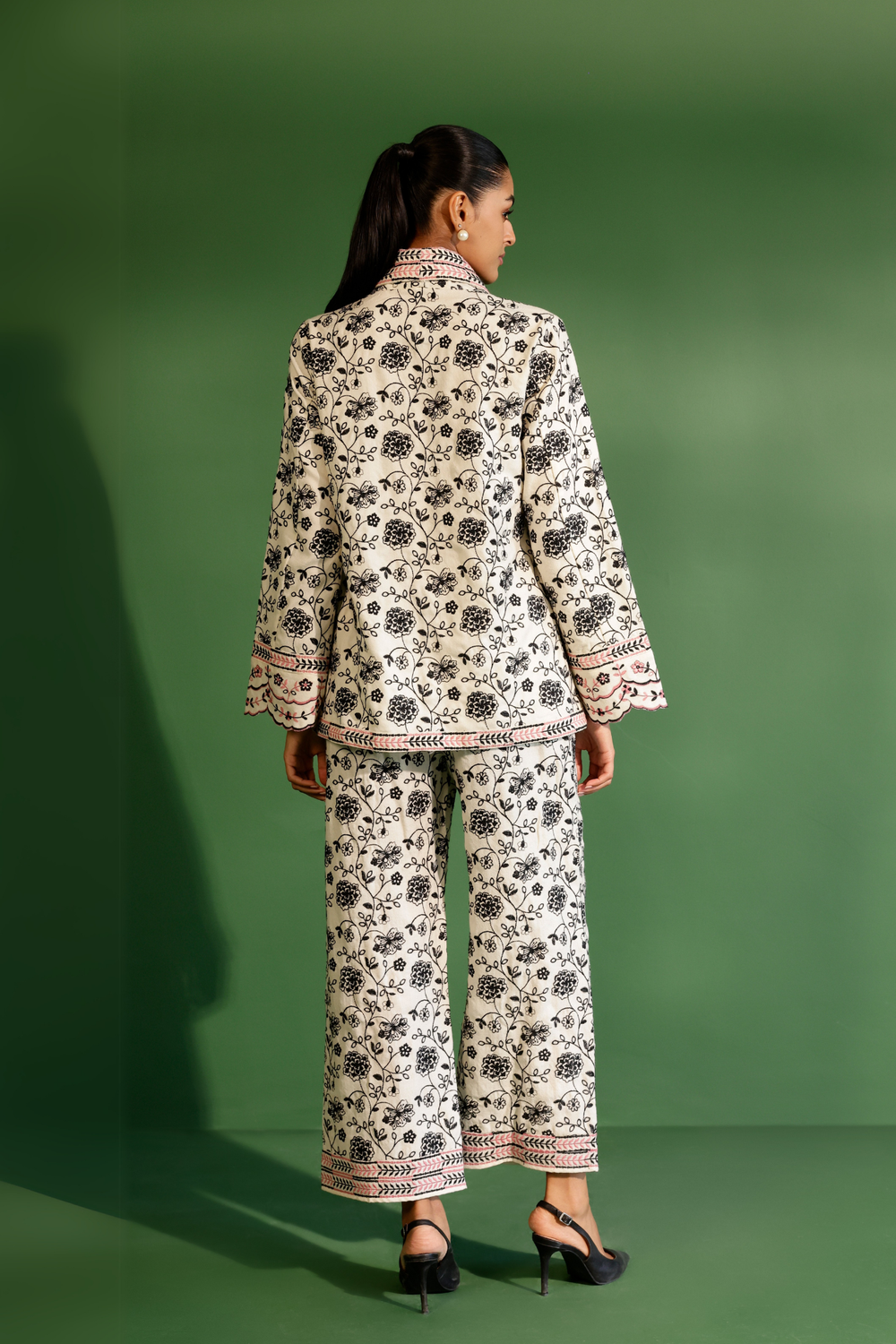 This stylish wool set exudes elegance with a modern twist on classic florals. the pristine white backdrop is adorned with intricate black floral motifs across both the top and wide-leg pants, creating a cohesive and eye-catching pattern. the top features a lapel with contrasting pink and black embroidery along the edges, adding a refined touch to the structured silhouette. the slightly flared cuffs echo the same embroidered detailing. the matching pants boast a wide-leg fit that flatters all body types. the hem is finished with matching pink and black embroidered borders, giving a balanced, structured finish to the overall outfit. this wool set is perfect for stepping out in style during cooler months. whether worn to a chic brunch or an elegant evening event, this set promises comfort, warmth, and an effortlessly sophisticated look.