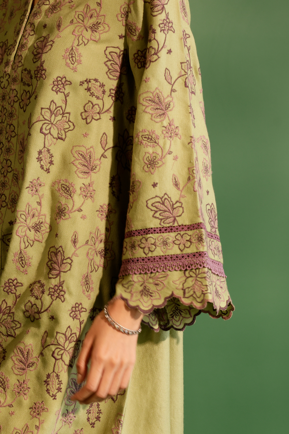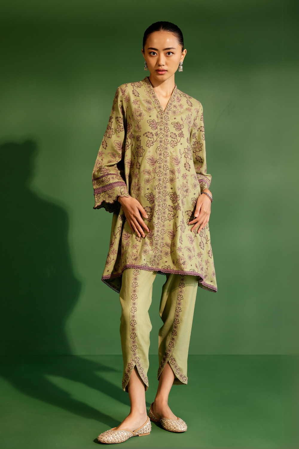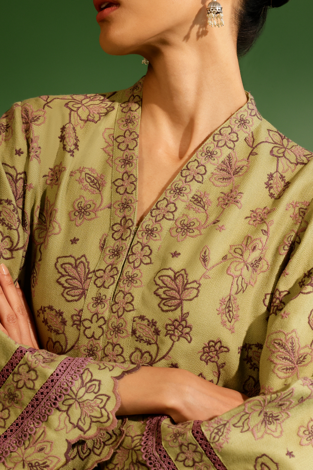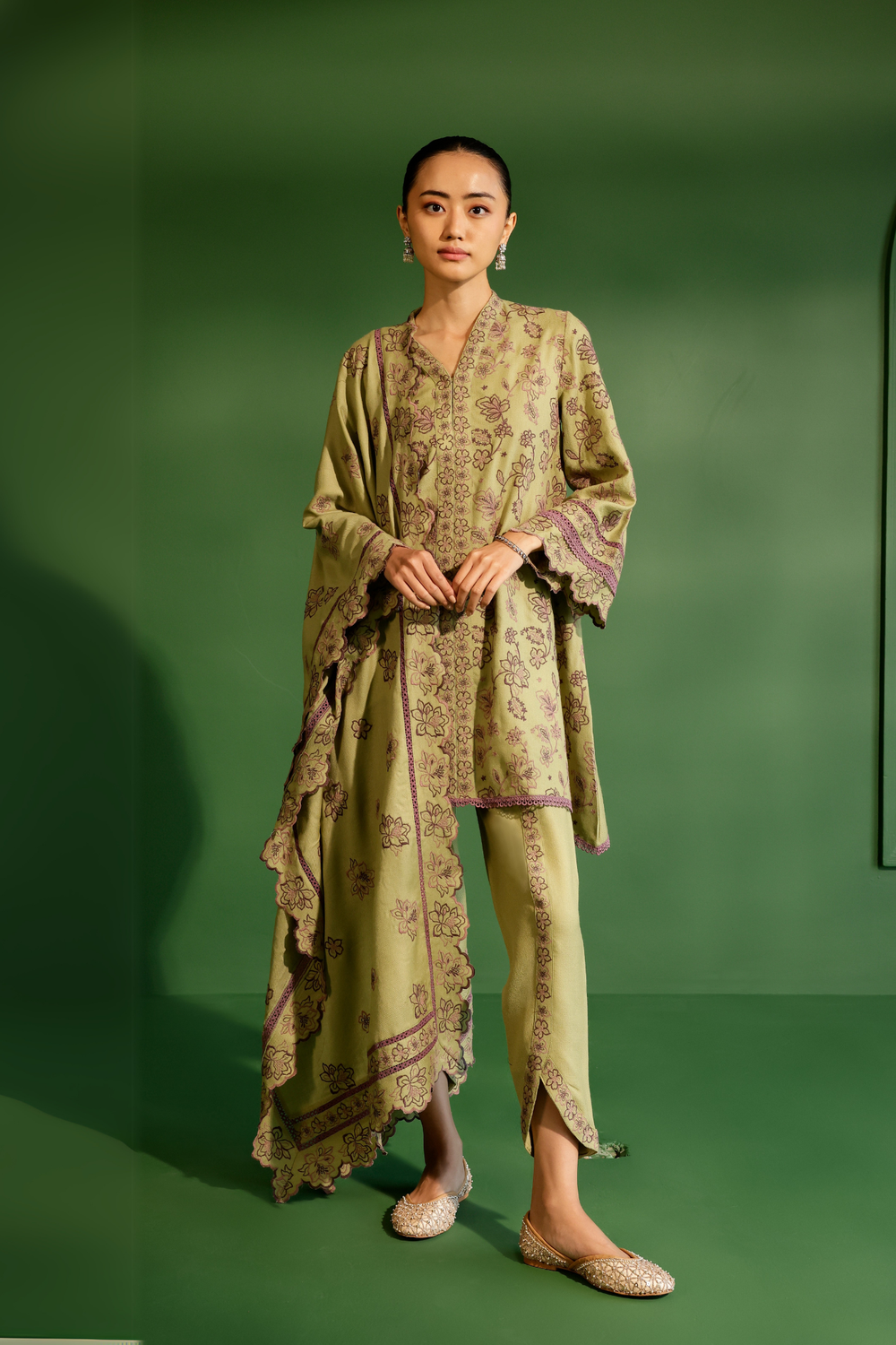 "embrace the elegance of understated charm with this green woolen kurta set, a perfect choice for those who favor elegance and comfort in equal measure. the bright color of the kurta is accented with contrasting floral embroidery. the relaxed silhouette offers both comfort and elegance, ideal for cozy gatherings and festive occasions alike. the neckline and sleeves are adorned with intricate floral patterns, and the scalloped hemline adds a gentle flair to the ensemble. accompanying the kurta is a matching pair of dhoti-style pants, designed for ease of movement and all-day comfort. complete with a matching embroidered shawl, this kurta set exudes elegance from head to toe. perfect for evening soirées, winter festivities, or intimate gatherings, this kurta set brings a modern yet timeless touch to your wardrobe."