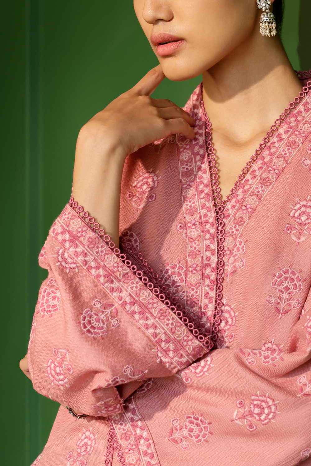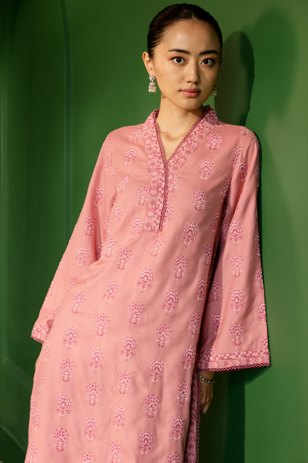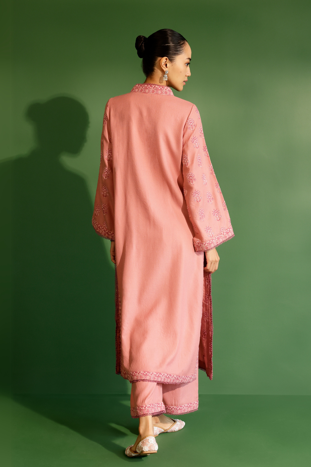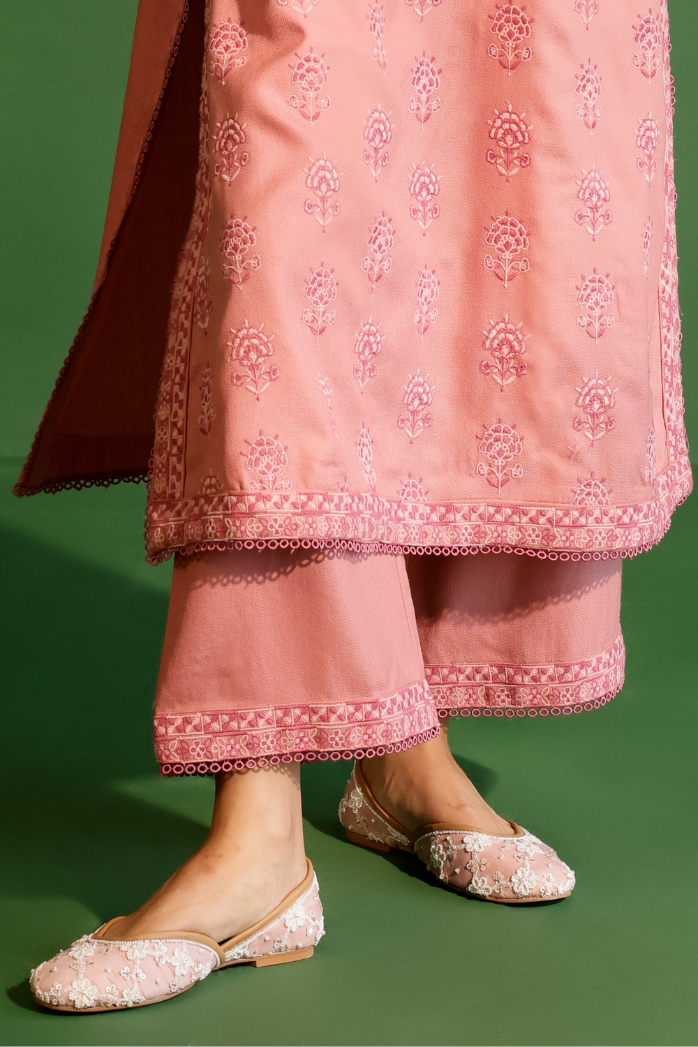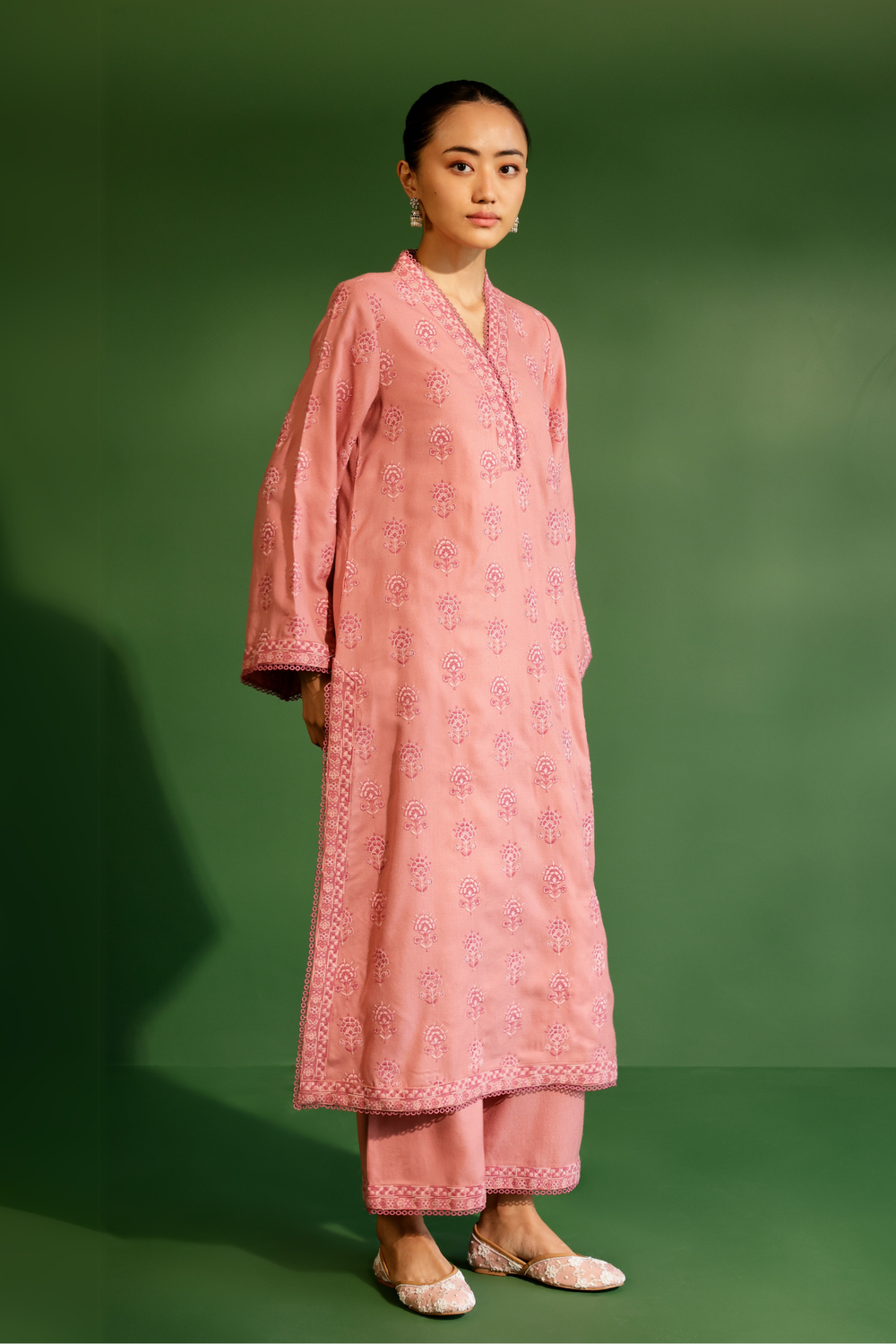Embrace elegance and comfort with our beautifully crafted woolen kurta set. the kurta is adorned with delicate floral motifs in soft pink, creating a subtle yet refined aesthetic that exudes grace. the v-neckline, relaxed sleeves, and a straight, comfortable cut offer ease of movement, ensuring a relaxed fit that flatters all body types. the set is completed with matching straight-cut pants that feature a coordinating embroidered hem.