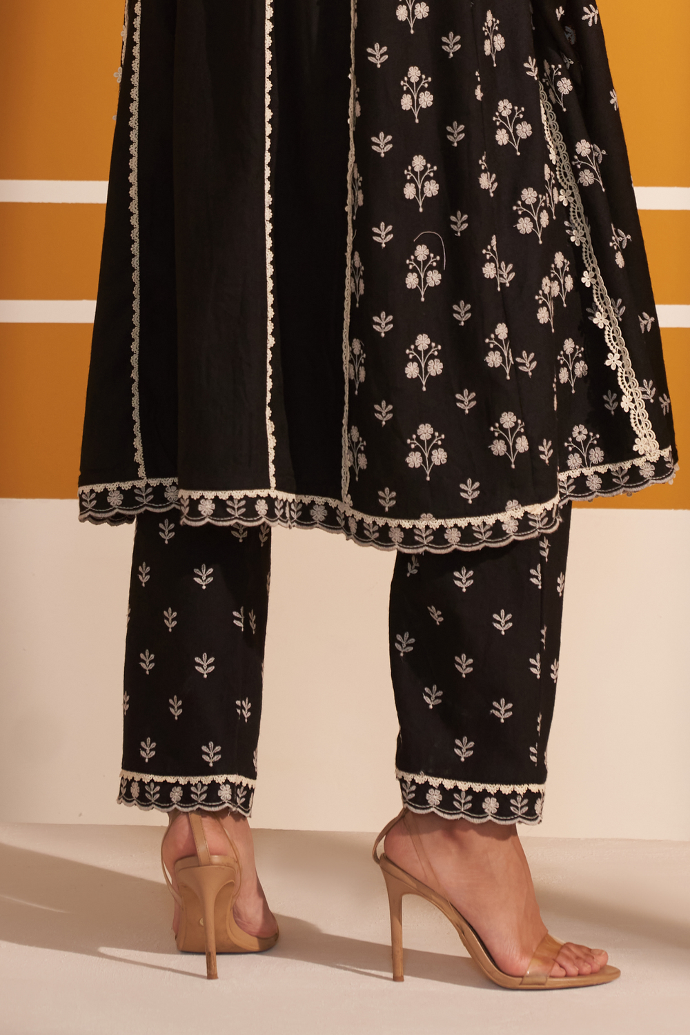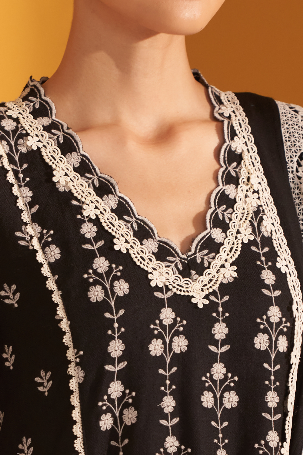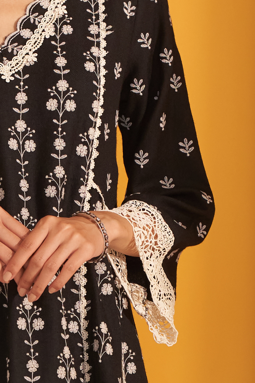 This exquisite wool set combines timeless elegance with intricate detailing, making it an ideal choice for winter gatherings. the rich black kurta is adorned with delicate white floral embroidery, creating a striking contrast that emphasizes its refined beauty. the v-neckline is edged with scalloped lace trim. the sleeves are slightly flared and are finished with broad lace panels at the cuffs. the straight-cut kurta is elegantly paired with straight pants, which are also adorned with embroidered floral motifs and finished with a delicate lace hem. accompanying the set is a matching dupatta that ties the entire look together. it’s framed with intricate lace borders, enhancing the ensemble’s feminine appeal. perfect for an evening event or festive gathering, this black and white wool set embodies a sophisticated blend of comfort and style.