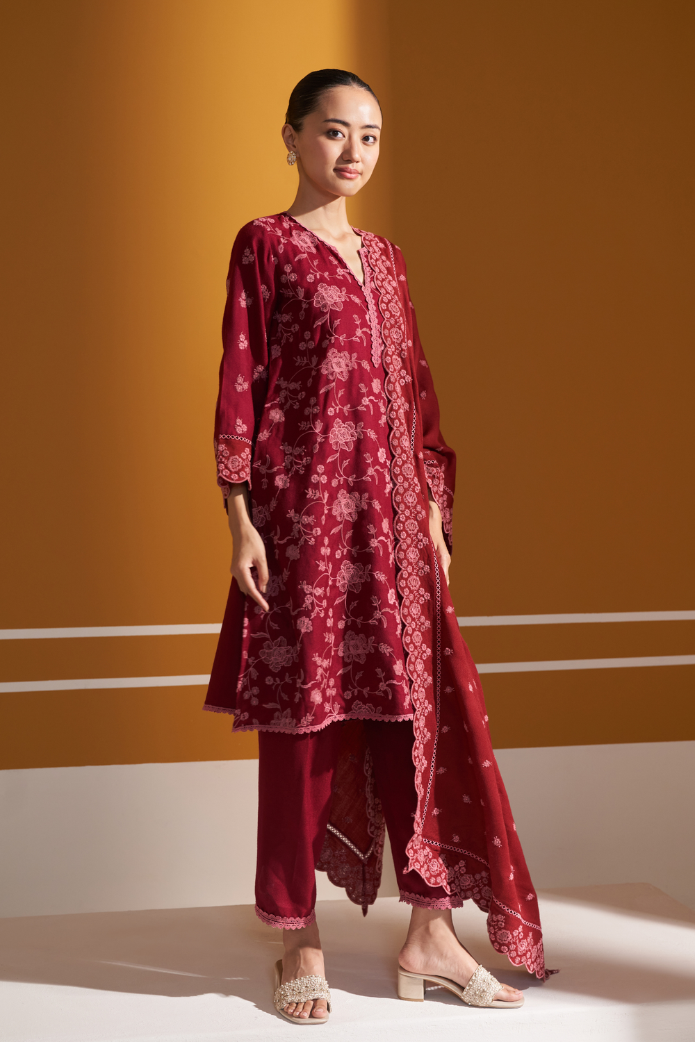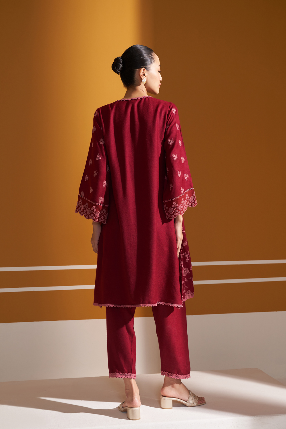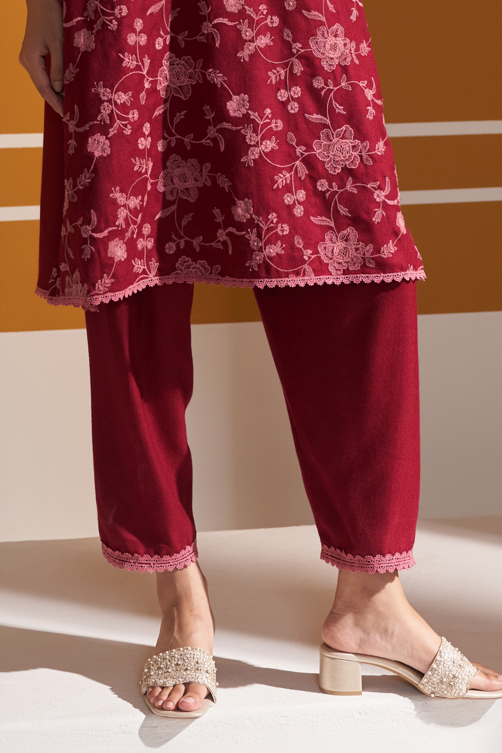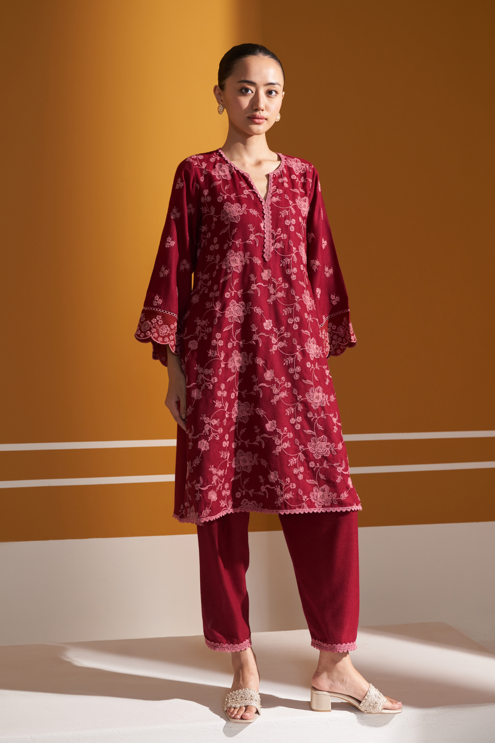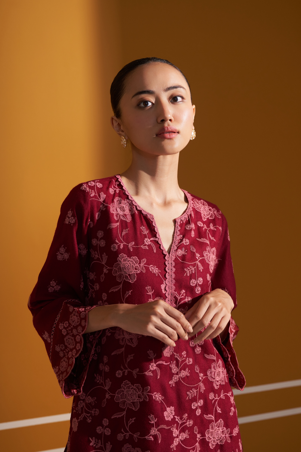 This rich maroon wool set is a luxurious fusion of comfort and elegance, perfect for a sophisticated winter look. the kurta is embellished with intricate floral embroidery in a soft pink hue. the kurta features a v-neckline framed by scalloped lace detailing in matching pink. the sleeves are finished with an embroidered cuff and scalloped edges. the matching pants are tailored for a sleek silhouette. they are completed with scalloped pink lace along the hem, tying the ensemble together beautifully. finish the look with the matching embroidered dupatta.