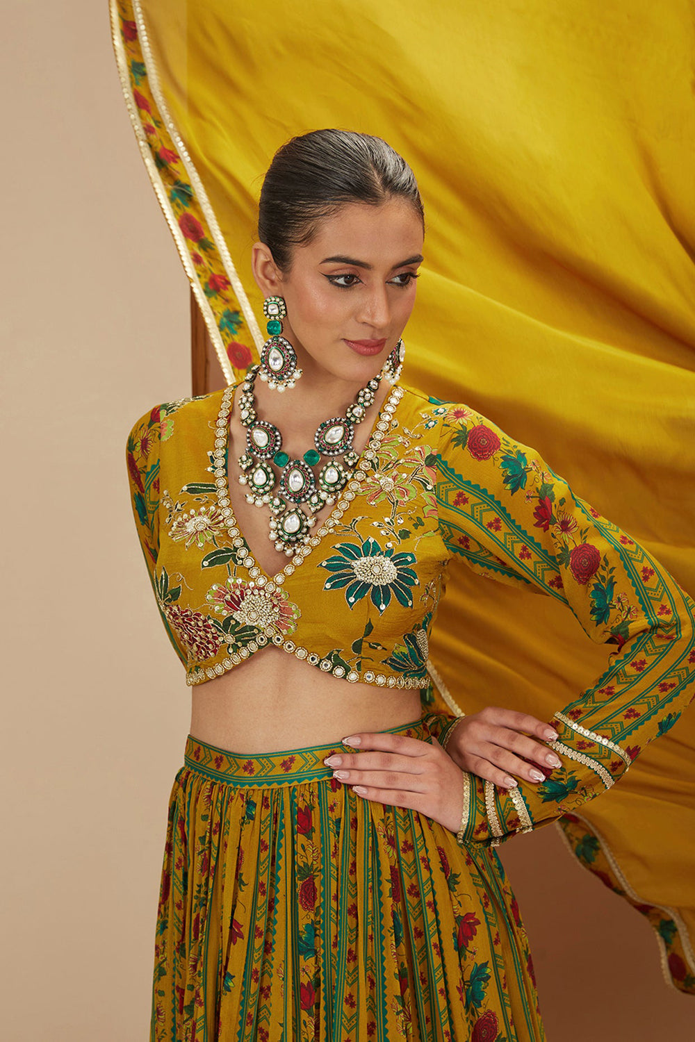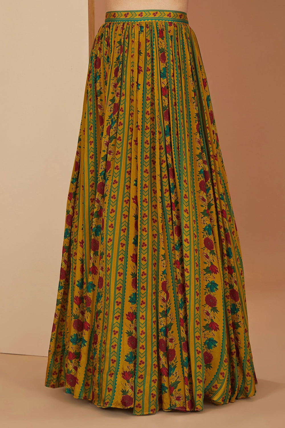 Mustard flared lehenga with attached can-can, all over multi color floral stripe print. Paired with printed padded blouse with all over zari, sequin, gota embroidered highlights & gota lace bordered dupatta.
