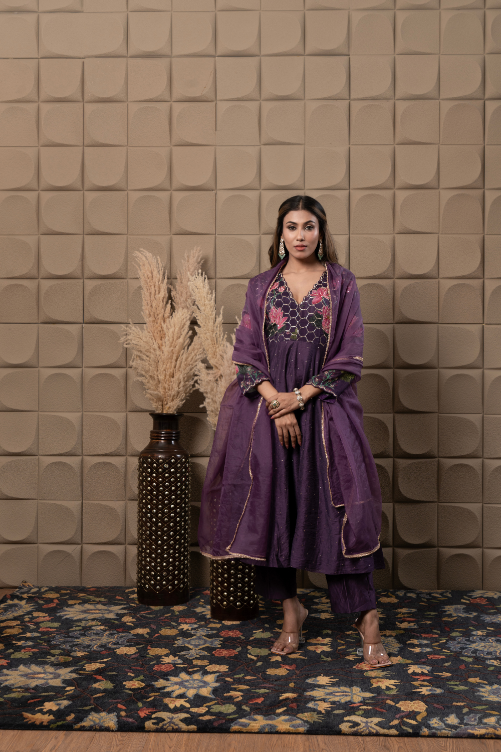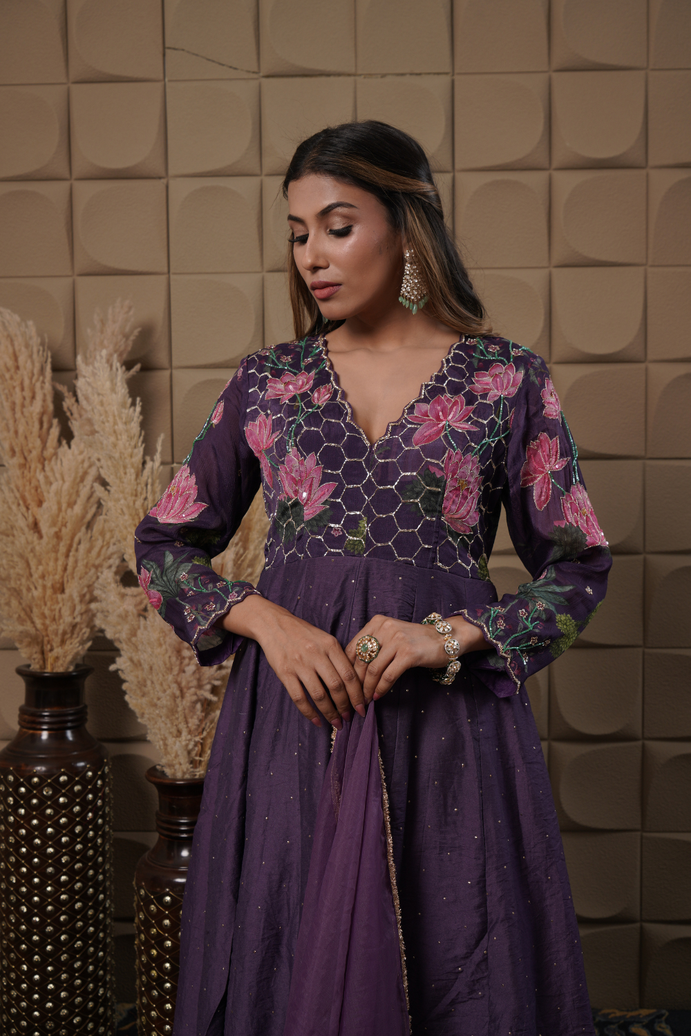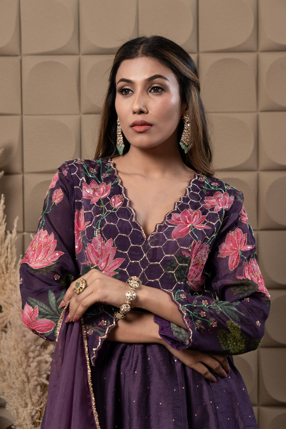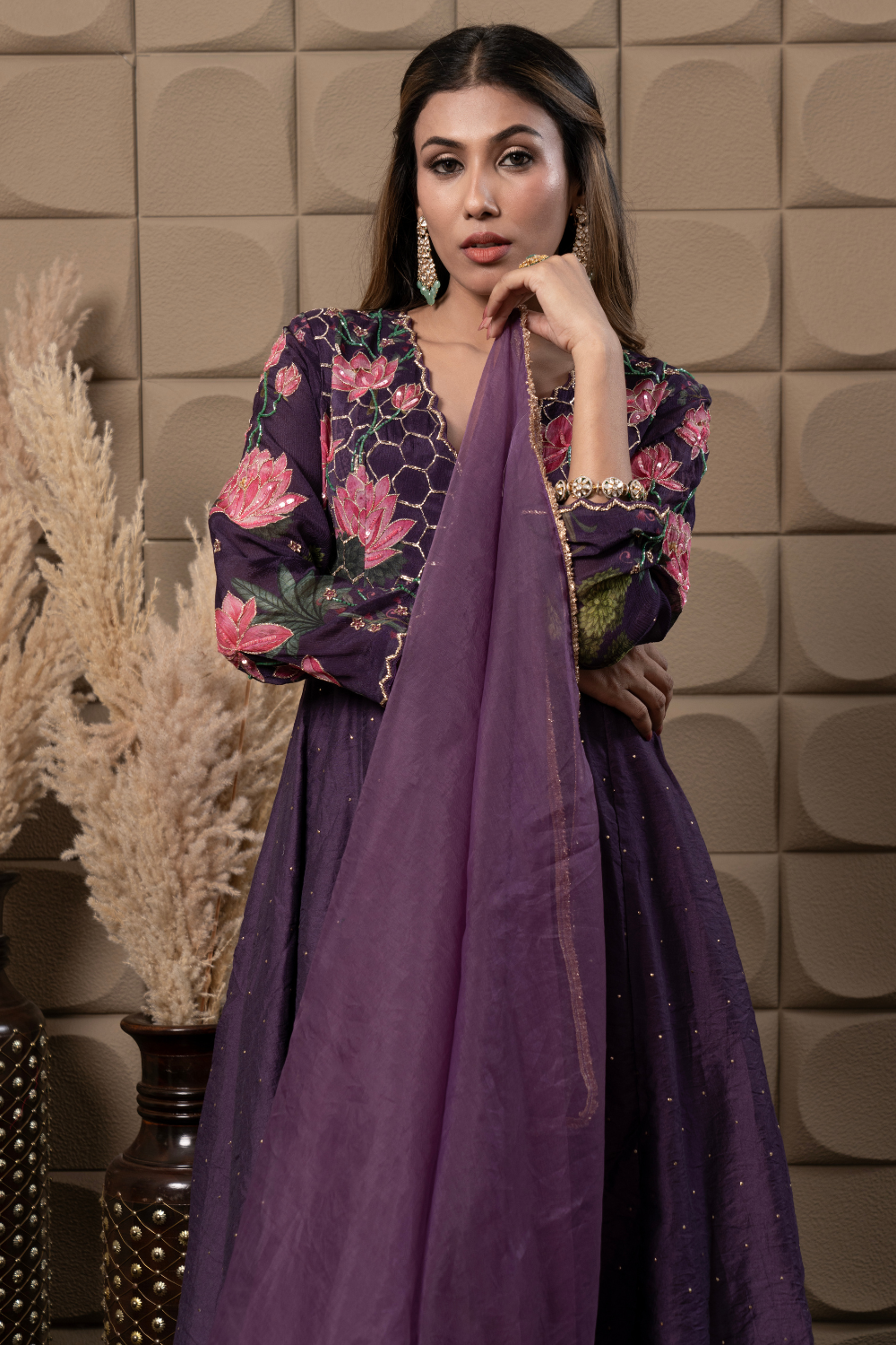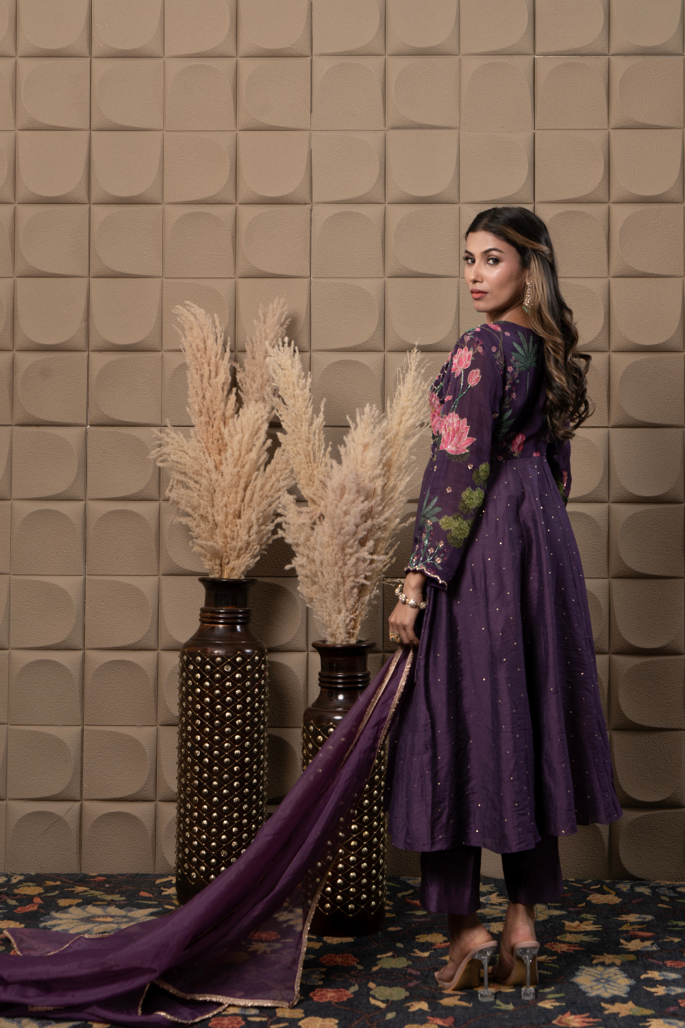 PRINTED YOKE WITH HAND EMBROIDERY WITH SEQUINS AND CUTDANA, MUKEISH CHNADERI ANARKALI AND PANTS WITH EMBROIDERED ORGANZA DUPATTA.