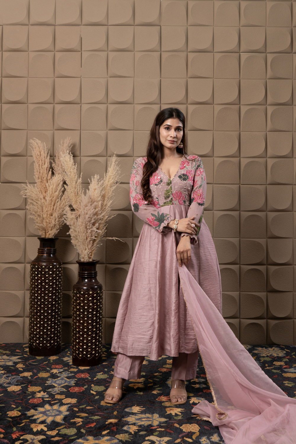 PRINTED YOKE WITH HAND EMBROIDERY WITH SEQUINS AND CUTDANA, MUKEISH CHNADERI ANARKALI AND PANTS WITH EMBROIDERED ORGANZA DUPATTA